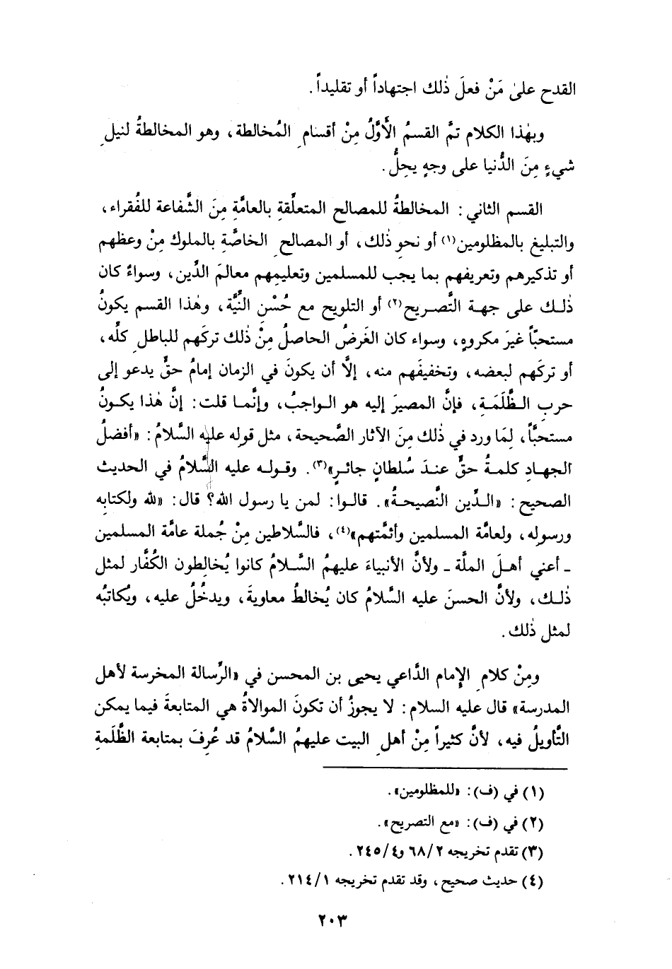 القسم الثاني: المخالطة للمصالح المتعلِّقة بالعامة من الشفاعة للفقراء، والتبليغ بالمظلومين (¬1) أو نحو ذلك، أو المصالح الخاصة بالملوك من وعظهم أو تذكيرهم وتعريفهم بما يجب للمسلمين وتعليمهم معالم الدين، وسواءٌ كان ذلك على جهة التصريح (¬2) أو التلويح مع حُسْنِ النية، وهذا القسم يكونُ مستحبّاً غير مكروهٍ، وسواء كان الغرض الحاصل من ذلك تركهم للباطل كله، أو تركهم لبعضه، وتخفيفَهم منه، إلاَّ أن يكون في الزمان إمامُ حقٍّ يدعو إلى حرب الظَّلَمَةِ، فإن المصير إليه هو الواجب، وإنما قلت: إن هذا يكون مستحبَّاً، لِمَا ورد في ذلك من الآثار الصحيحة، مثل قوله عليه السلام: " أفضل الجهاد كلمة حقٍّ عند سلطانٍ جائرٍ " (¬3). وقوله عليه السلام في الحديث الصحيح: " الدين النصيحة ". قالوا: لمن يا رسول الله؟ قال: " لله ولكتابه ورسوله، ولعامة المسلمين وأئمتهم " (¬4)، فالسلاطين من جملة عامة المسلمين -أعني أهل الملة- ولأن الأنبياء عليهم السلام كانوا يخالطون الكفار لمثل ذلك، ولأن الحسن عليه السلام كان يُخالط معاوية، ويدخُلُ عليه، ويُكاتبُه لمثل ذلك.