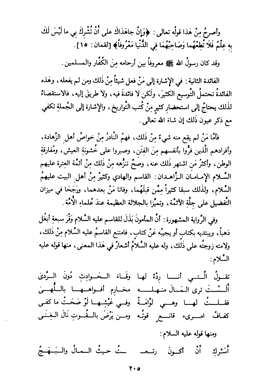 وفي الرواية المشهورة: أن المأمون بَذَلَ للقاسم عليه السلام وَقْرَ سبعة أبغُل ذهباً، ويبتديه بكتابٍ أو يجيبُه عن كتابٍ، فامتنع القاسم عليه السلام من ذلك، ولامته زوجته على ذلك، وله عليه السلام أشعارٌ في هذا المعنى، منها قوله عليه السلام: