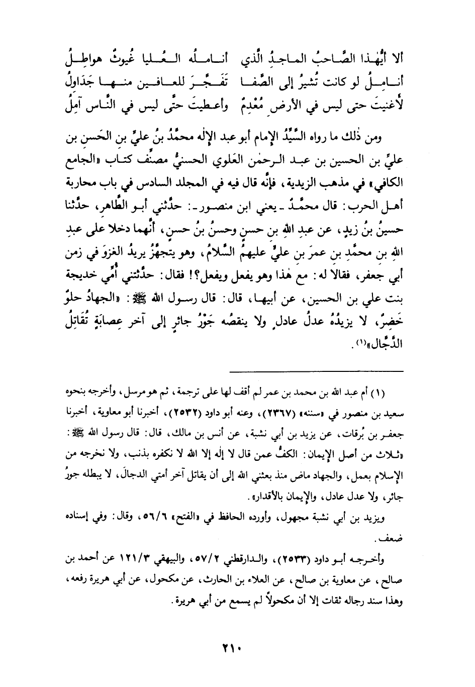ومن ذلك ما رواه السيد الإمام أبو عبد الإله محمد بن علي بن الحسن بن علي بن الحسين بن عبد الرحمن العلوي الحسني مصنف كتاب " الجامع الكافي " في مذهب الزيدية، فإنه قال فيه في المجلد السادس في باب محاربة أهل الحرب: قال محمد -يعني ابن منصور-: حدثني أبو الطاهر، حدثنا حسين بن زيدٍ، عن عبد الله بن حسنٍ وحسنُ بن حسنٍ، إنهما دخلا على عبد الله بن محمد بن عمر بن علي عليهم السلام، وهو يتجهَّز يريد الغزو في زمن أبي جعفر، فقالا له: مع هذا وهو يفعل ويفعل؟! فقال: حدثتني أمي خديجة بنت علي بن الحسين، عن أبيها، قال: قال رسول الله - صلى الله عليه وسلم -: " الجهاد حلوٌ خَضِرٌ، لا يزيده عدل عادلٍ ولا ينقصه جور جائرٍ إلى آخر عصابة تقاتلُ الدجال " (¬1).