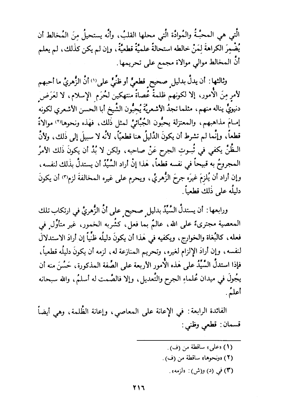 وثالثها: أن يدل بدليل صحيح قطعي أو ظني على (¬1) أن الزهري ما أحبهم لأمرٍ من الأمور، إلاَّ لكونهم ظلمةً عُصاة منتهكين لحُرَمِ الإسلام، لا لعَرَضٍ دنيوي يناله منهم، مثلما تجد الأشعريَّة يُحِبُّون الشيخ أبا الحسن الأشعري لكونه إمام مذاهبهم، والمعتزلة يحبُّون الجُبَّائيَّ لمثل ذلك، فهذه ونحوها (¬2) موالاةٌ قطعاً، وإنما لم تشرط أن يكون الدليل هنا قطعياً، لأنه لا سبيل إلى ذلك، ولأن الظنَّ يكفي في ثُبوت الجرح عن صاحبه، ولكن لا بُدَّ أن يكون ذلك الأمرُ المجروح به قبيحاً في نفسه قطعاً، هذا إن أراد السيد أن يستدل بذلك لنفسه، وإن أراد أن يُلزِمَ غيره جرح الزهري، ويحرم على غيره المخالفة لزم (¬3) أن يكون دليله على ذلك قطعياً.