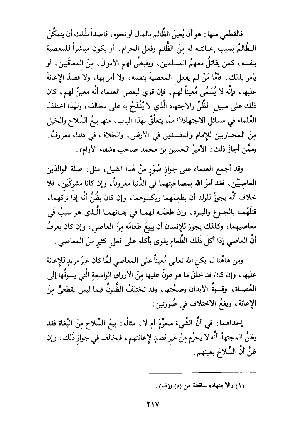 فالقطعي منها: هو أن يُعين الظالم بالمال أو نحوه، قاصداً بذلك أن يتمكَّن الظالم بسبب إعانته له من الظلم وفعل الحرام، أو يكون مباشراً للمعصية بنفسه، كمن يقاتل معهم المسلمين، ويقبضُ لهم الأموال، من المعاقبين، أو يأمر بذلك. فأما من لم يفعل المعصية بنفسه، ولا أمر بها، ولا قصدَ الإعانةَ عليها، فإنه لا يُسَمَّى مُعيناً لهم، فإن قوي لبعض العلماء أنه معينٌ لهم، كان ذلك على سبيل الظن والاجتهاد الذي لا يُقْدَحُ به على مخالفه، ولهذا اختلف العلماء في مسائل الاجتهاد (¬1) مما يتعلق بهذا الباب، منها بيع السلاح والخيل من المحاربين للإمام والمفسدين في الأرض، والخلاف في ذلك معروفٌ. وممن أجاز ذلك: الأمير الحسين بن محمد صاحب " شفاء الأوام ".