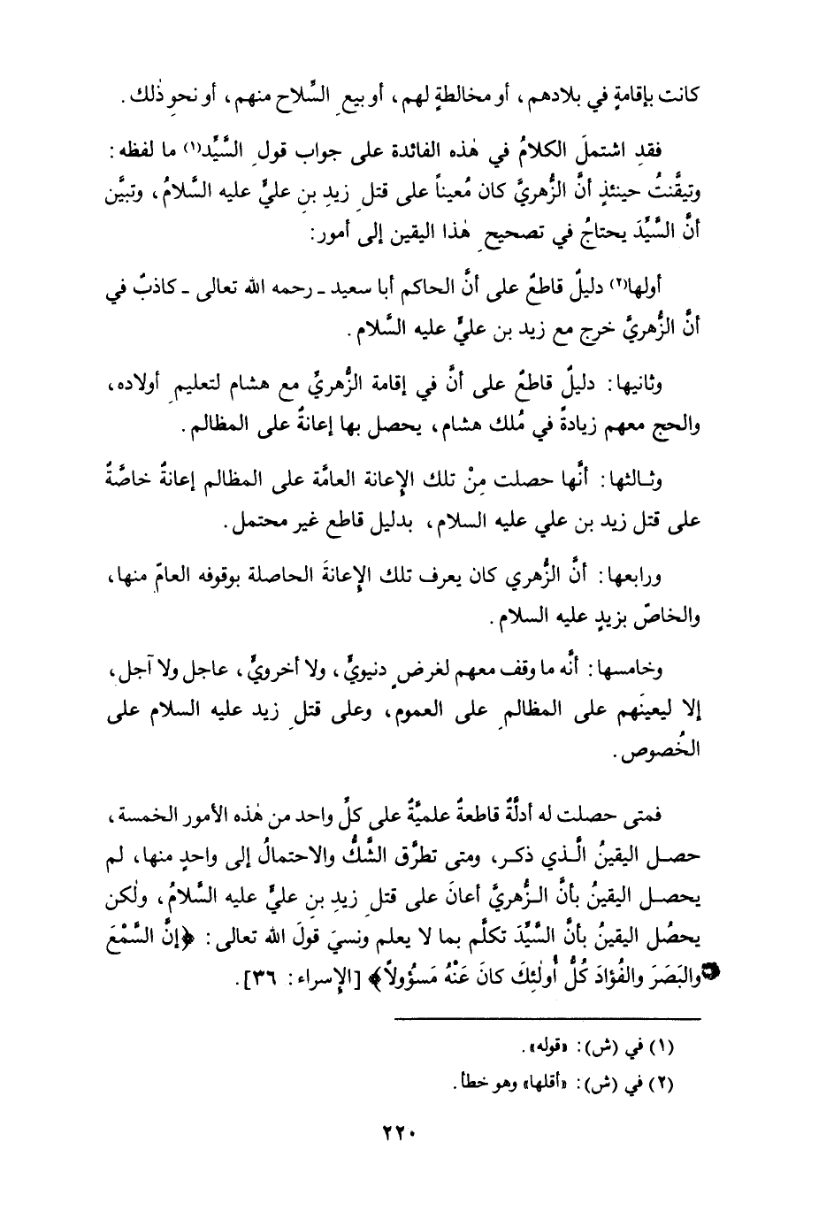 فمتى حصلت له أدلةٌ قاطعةٌ علميةٌ على كل واحد من هذه الأمور الخمسة، حصل اليقين الذي ذكر، ومتى تطرق الشك والاحتمال إلى واحدٍ منها، لم يحصل اليقين بأن الزهري أعان على قتل زيد بن علي عليه السلام، ولكن يحصل اليقين بأن السيد تكلم بما لا يعلم ونسي قول الله تعالى: {إِنَّ السَّمْعَ وَالْبَصَرَ وَالْفُؤَادَ كُلُّ أُولَئِكَ كَانَ عَنْهُ مَسْئُولًا} [الإسراء: 36].