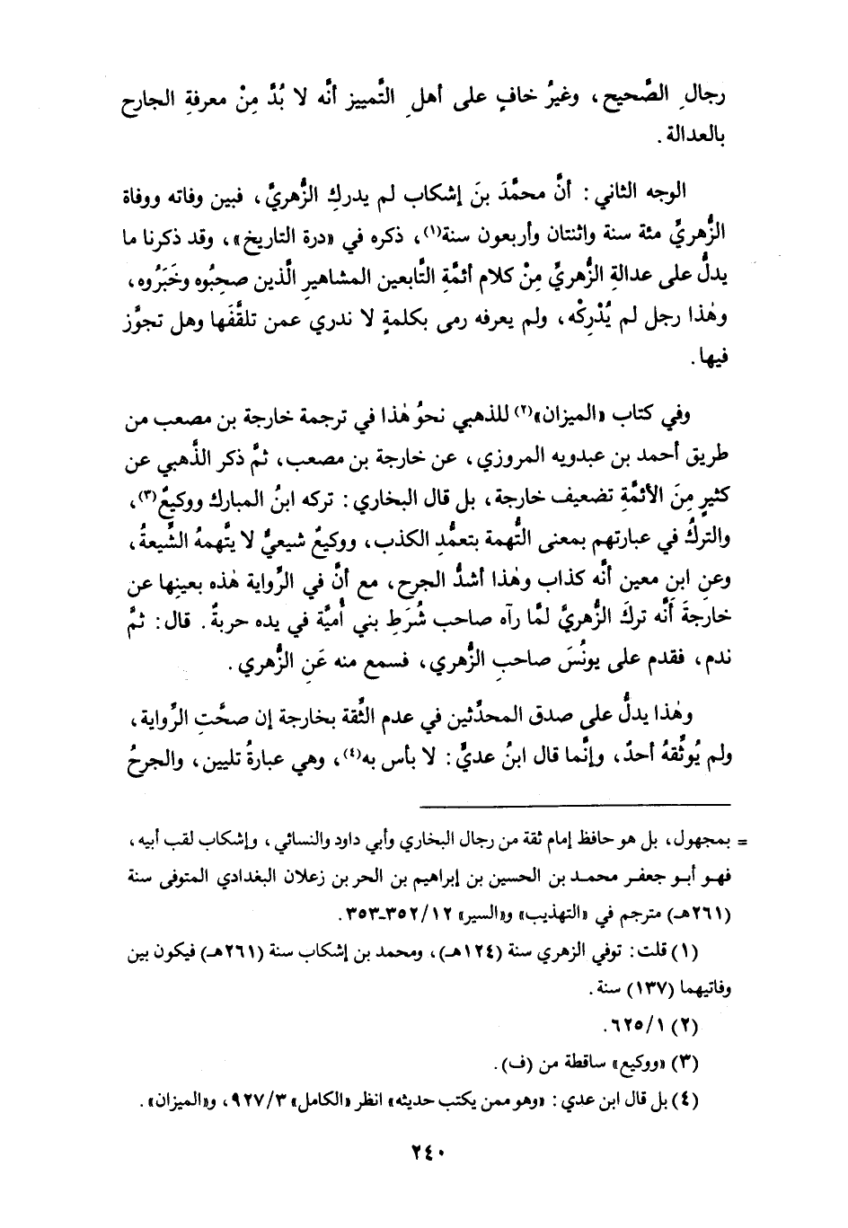 الوجه الثاني: أن محمد بن إشكاب لم يدرك الزهري، فبين وفاته ووفاة الزهري مئة سنة واثنتان وأربعون سنة (¬1)، ذكره في " درة التاريخ "، وقد ذكرنا ما يدل على عدالة الزهري من كلام أئمة التابعين المشاهير الذين صحِبُوه وخَبَرُوه، وهذا رجل لم يدركه، ولم يعرفه رمى بكلمةٍ لا ندري عمن تلقَّفَها وهل تجوَّز فيها.