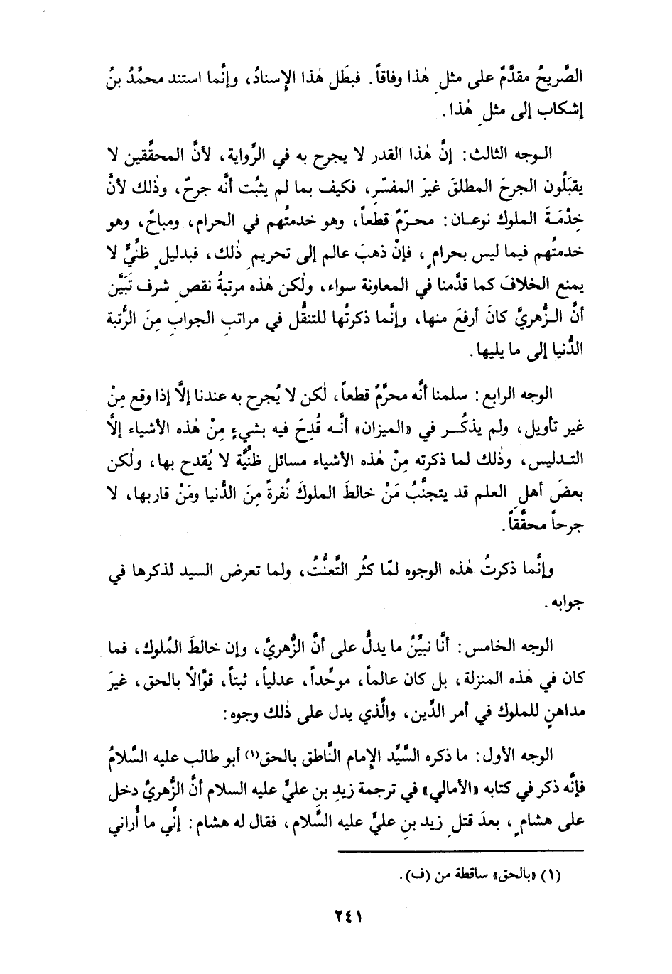 الوجه الخامس: أنَّا نبيِّنُ ما يدل على أن الزهري، وإن خالط الملوك، فما كان في هذه المنزلة، بل كان عالماً، موحِّداً، عدلياً، ثبتاً، قوَّالاً بالحق، غير مداهنٍ للملوك في أمر الدين، والذي يدل على ذلك وجوه: