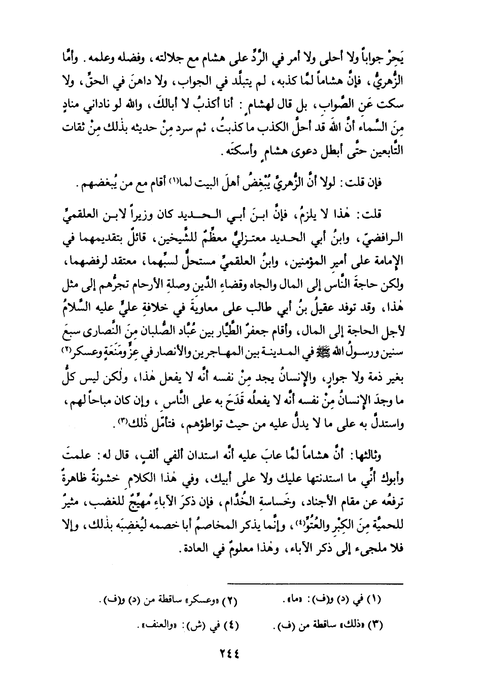 وثالثها: أن هشاماً لما عاب عليه أنه استدان ألفي ألفٍ، قال له: علمت وأبوك أني ما استدنتها عليك ولا على أبيك، وفي هذا الكلام خشونةٌ ظاهرةٌ ترفعه عن مقام الأجناد، وخَساسة الخُدَّام، فإن ذكر الآباء مُهيِّجٌ للغضب، مثيرٌ للحمية من الكِبْرِ والعُتُوِّ (¬4)، وإنما يذكر المخاصم أبا خصمه ليُغصِبَه بذلك، وإلا فلا ملجىء إلى ذكر الآباء، وهذا معلومٌ في العادة.