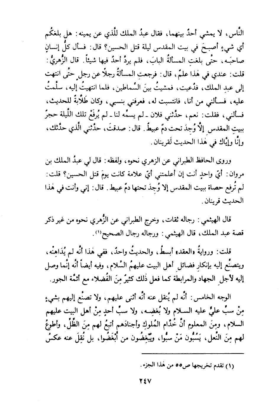 الناس، لا يمشي أحدٌ بينهما، فقال عبد الملك للذي عن يمينه: هل بلغكم أي شيءٍ أصبح في بيت المقدس ليلة قتل الحسين؟ قال: فسأل كل إنسانٍ صاحبه، حتى بلغت المسألة الباب، فلم يرد أحدٌ فيها شيئاً. قال الزهري: قلت: عندي في هذا علمٌ، قال: فرجعت المسألة رجلاً عن رجلٍ حتى انتهت إلى عبد الملك، فدُعيت، فمشيت بين السِّماطين، فلما انتهيت إليه، سلَّمتُ عليه، فسألني من أنا، فانتسبت له، فعرفني بنسبي، وكان طلاَّبةً للحديث، فسألني، فقلت: نعم، حدثني فلان -لم يسمِّه لنا- لم يُرفَعْ تلك الليلة حجرٌ ببيت المقدس إلاَّ وُجِدَ تحت دمٌ عبيطٌ. قال: صدقت، حدثني الذي حدثك، وإنَّا وإيَّاك في هذا الحديث لقرينان.