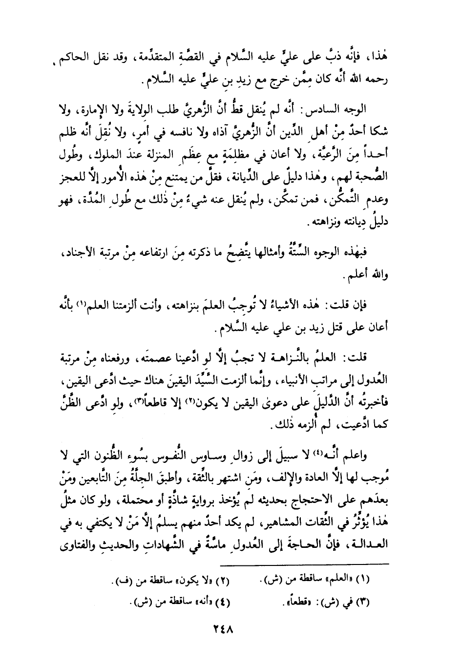 قلت: العلم بالنزاهة لا تجب إلاَّ لو ادَّعينا عصمته، ورفعناه من مرتبة العدول إلى مراتب الأنبياء، وإنما ألزمت السيد اليقين هناك حيث ادعى اليقين، فأخبرته أن الدليل على دعوى اليقين لا يكون (¬2) إلاَّ قاطعاً (¬3)، ولوِ ادَّعى الظن كما ادعيت، لم أُلزمه ذلك.