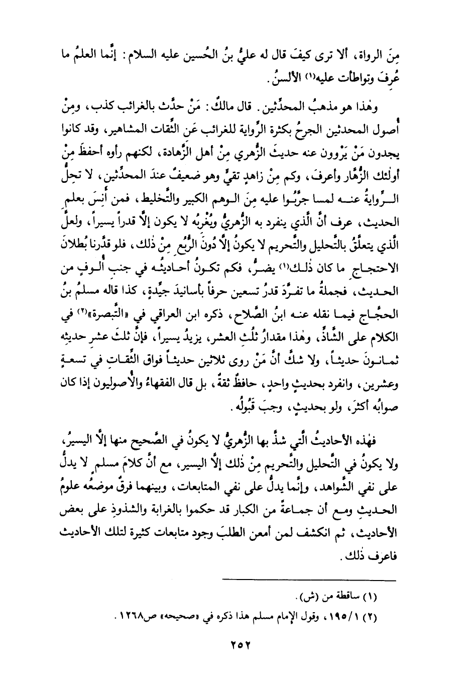 فهذه الأحاديث التي شذ بها الزهري لا يكون في الصحيح منها إلاَّ اليسير، ولا يكون في التحليل والتحريم من ذلك إلاَّ اليسير، مع أن كلام مسلمٍ لا يدلُّ على نفي الشواهد، وإنما يدلُّ على نفي المتابعات، وبينهما فرقٌ موضعه علوم الحديث ومع أن جماعةً من الكبار قد حكموا بالغرابة والشذوذ على بعض الأحاديث، ثم انكشف لمن أمعن الطلب وجود متابعات كثيرة لتلك الأحاديث فاعرف ذلك.