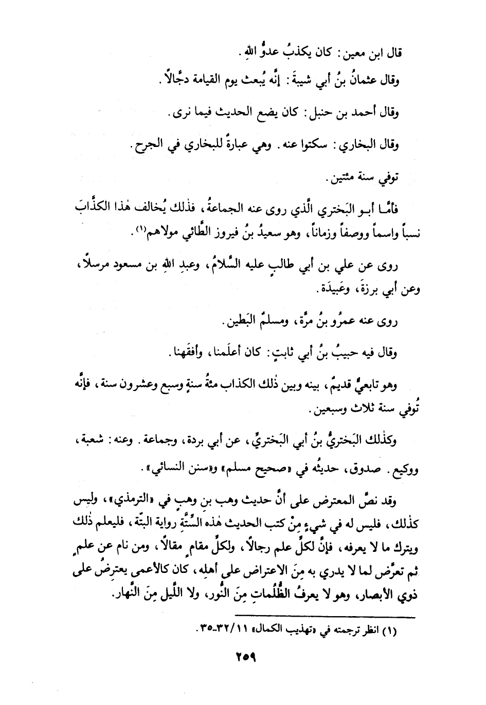 فأما أبو البختري الذي روى عنه الجماعة، فذلك يخالف هذا الكذَّاب نسباً واسماً ووصفاً وزماناً، وهو سعيد بن فيروز الطَّائي مولاهم (¬1).
