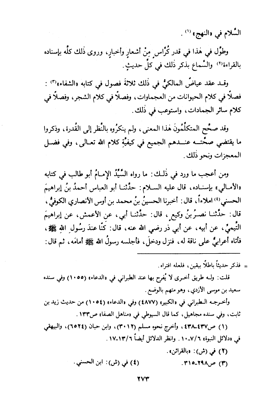 وقد عقد عياضٌ المالكي في ذلك ثلاثة فصول في كتابه " الشفاء " (¬3): فصلاً في كلام الحيوانات من العجماوات، وفصلاً في كلام الشجر، وفصلاً في كلام سائر الجمادات، واستوعب في ذلك.