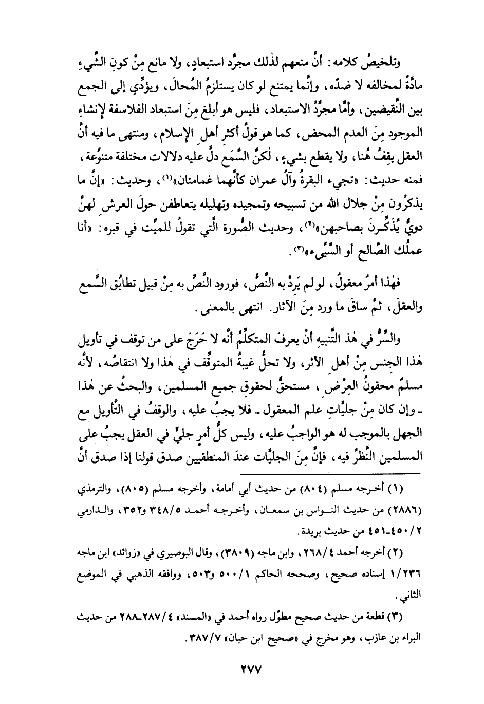 وتلخيصُ كلامه: أن منعهم لذلك مجرَّد استبعاد، ولا مانع من كون الشيء مادة لمخالفه لا ضده، وإنما يمتنع لو كان يستلزم المُحال، ويؤدِّي إلى الجمع بين النَّقيضين، وأمَّا مجرَّدُ الاستبعاد، فليس هو أبلغ من استبعاد الفلاسفة لإنشاءِ الموجود مِنَ العدم المحض، كما هو قول أكثر أهل الإسلام، ومنتهى ما فيه أنَّ العقل يقِفُ هنا، ولا يقطع بشيءٍ، لكن السمع دلَّ عليه دلالات مختلفة متنوِّعة، فمنه حديث: " تجيء البقرة وآل عمران كأنَّهما غمامتان " (¬1)، وحديث: " إن ما يذكرون مِنْ جلال الله من تسبيحه وتمجيده وتهليله يتعاطفن حول العرش لهن دويٌّ يُذَكِّرن بصاحبهن " (¬2)، وحديث الصورة التي تقول للميِّت في قبره: " أنا عملُك الصَّالح أو السَّيِّىء " (¬3).