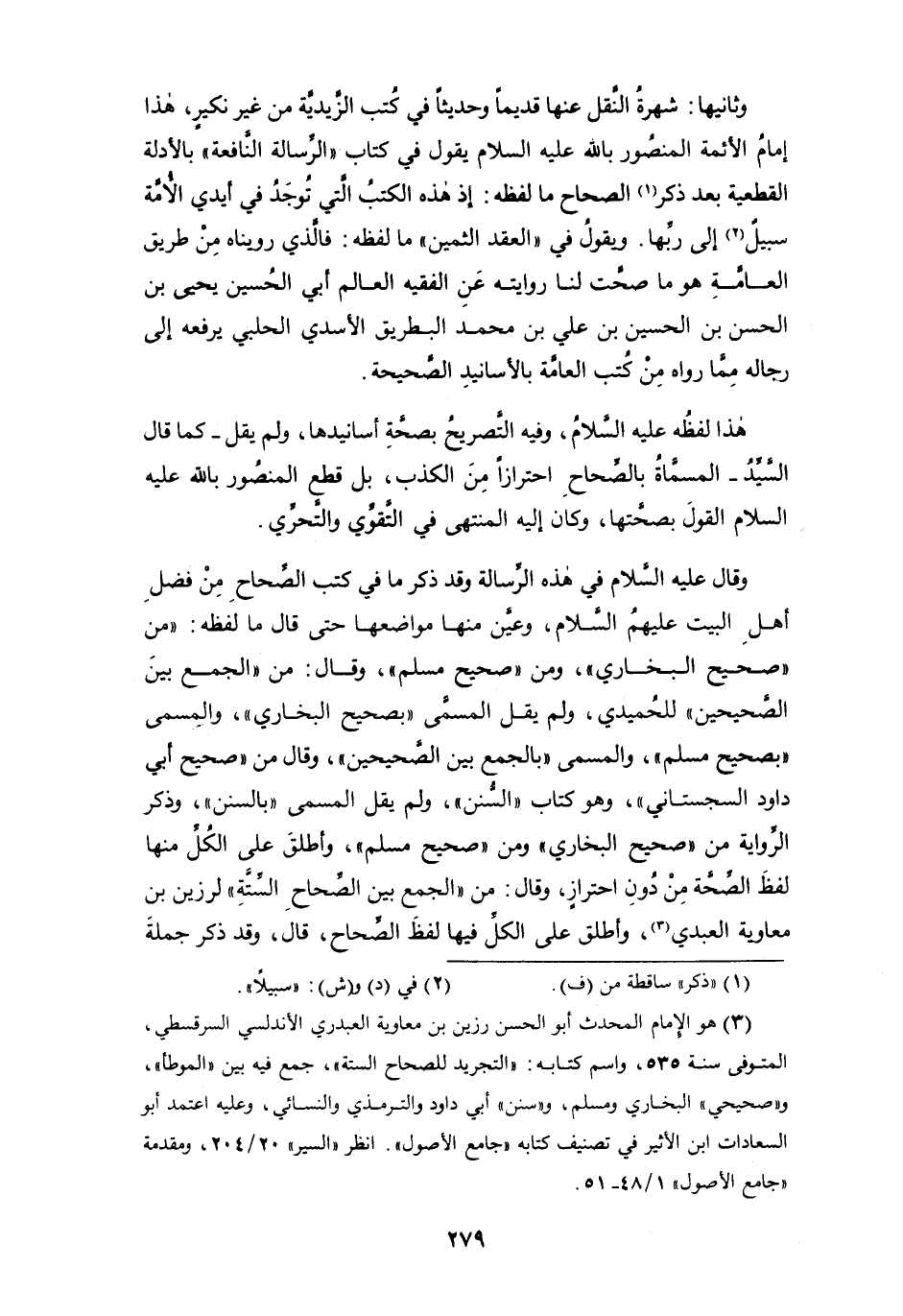 وقال عليه السلام في هذه الرسالة وقد ذكر ما في كتب الصحاح من فضل أهل البيت عليهم السلام، وعيَّن منها مواضعها حتى قال ما لفظه: " من " صحيح البخاري "، ومن " صحيح مسلم "، وقال: من " الجمع بين الصحيحين " للحُميدي، ولم يقل المسمى " بصحيح البخاري "، والمسمى " بصحيح مسلم "، والمسمى " بالجمع بين الصحيحين "، وقال من " صحيح أبي داود السجستاني "، وهو كتاب " السنن "، ولم يقل المسمى " بالسنن "، وذكر الرواية من " صحيح البخاري " ومن " صحيح مسلم "، وأطلق على الكُلِّ منها لفظ الصِّحة من دون احترازٍ، وقال: من " الجمع بين الصحاح الستة " لرزين بن معاوية العبدي (¬3)، وأطلق على الكل فيها لفظ الصحاح، قال، وقد ذكر جملة