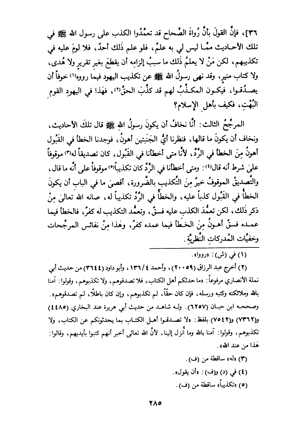 36]، فإن القول بأنَّ رواة الصِّحاح قد تعمَّدُوا الكذب على رسول الله - صلى الله عليه وسلم - في تلك الأحاديث مما ليس لي به علمٌ، فلو علم ذلك أحدٌ، فلا لوم عليه في تكذيبهم، لكن من لا يعلمُ ذلك ما سبب إلزامِه أن يقطع بغير تقريرٍ ولا هُدى، ولا كتاب منيرٍ، وقد نهى رسول الله - صلى الله عليه وسلم - عن تكذيب اليهود فيما رووه (¬1) خوفاً أن يصدقوا، فيكون المكذِّب لهم قد كذَّت الحق (¬2)، فهذا في اليهود القوم البُهْتِ، فكيف بأهل الإسلام؟