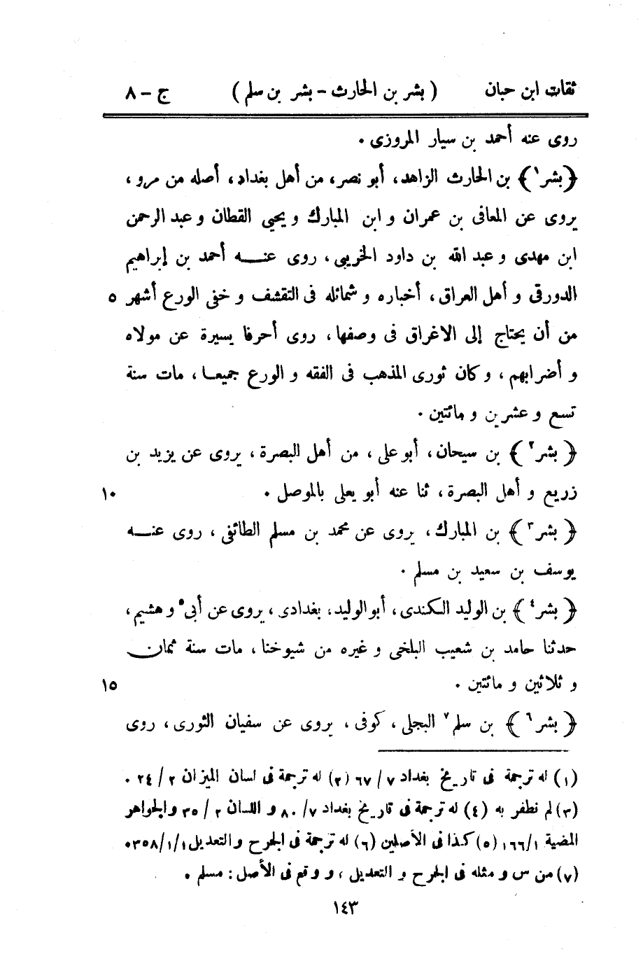 12651 - بشر بن الْحَارِث الزَّاهِد أَبُو نصر من أهل بَغْدَاد أَصله من مرو يروي عَن الْمعَافي بن عمرَان وَابْن الْمُبَارك وَيحيى الْقطَّان وَعبد الرَّحْمَن بن مهدى وَعبد الله بن دَاوُد الْخُرَيْبِي روى عَنهُ أَحْمد بن إِبْرَاهِيم الدَّوْرَقِي وَأهل الْعرَاق وأخباره وشمائله فِي التقشف وخفي الْوَرع أشهر مِنْ أَنْ يُحْتَاجَ إِلَى الإِغْرَاقِ فِي وصفهَا روى أحرفا يسيرَة عَن مَوْلَاهُ وأضرابهم وَكَانَ ثوري الْمَذْهَب فِي الْفِقْه والورع جَمِيعًا مَاتَ سنة تسع وَعشْرين وَمِائَتَيْنِ