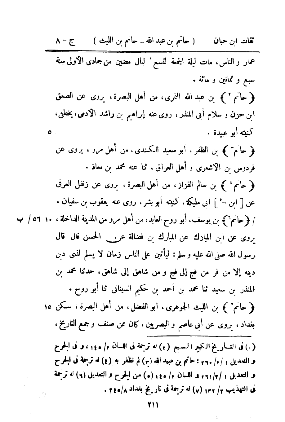 13046 - حَاتِم بن يُوسُف أَبُو روح العابد من أهل مرو من الْمَدِينَة الدَّاخِلَة يرْوى عَن بن الْمُبَارَكِ عَنِ الْمُبَارَكِ بْنِ فَضَالَةَ عَنِ الْحَسَنِ قَالَ قَالَ رَسُولُ اللَّهِ صَلَّى اللَّهُ عَلَيْهِ وَسَلَّمَ لَيَأْتِيَنَّ عَلَى النَّاسِ زَمَانٌ لَا يَسْلَمُ لِذِي دِينٍ دِينُهُ إِلا مَنْ فَرَّ مِنْ فَجٍّ إِلَى فَجٍّ وَمِنْ شَاهِقٍ إِلَى شَاهِقٍ حَدثنَا مُحَمَّد بن الْمُنْذر بن سَعِيدٍ ثَنَا مُحَمَّدُ بْنُ أَحْمَدَ بْنِ حَكِيمٍ السّينَانِيُّ ثَنَا أَبُو روح