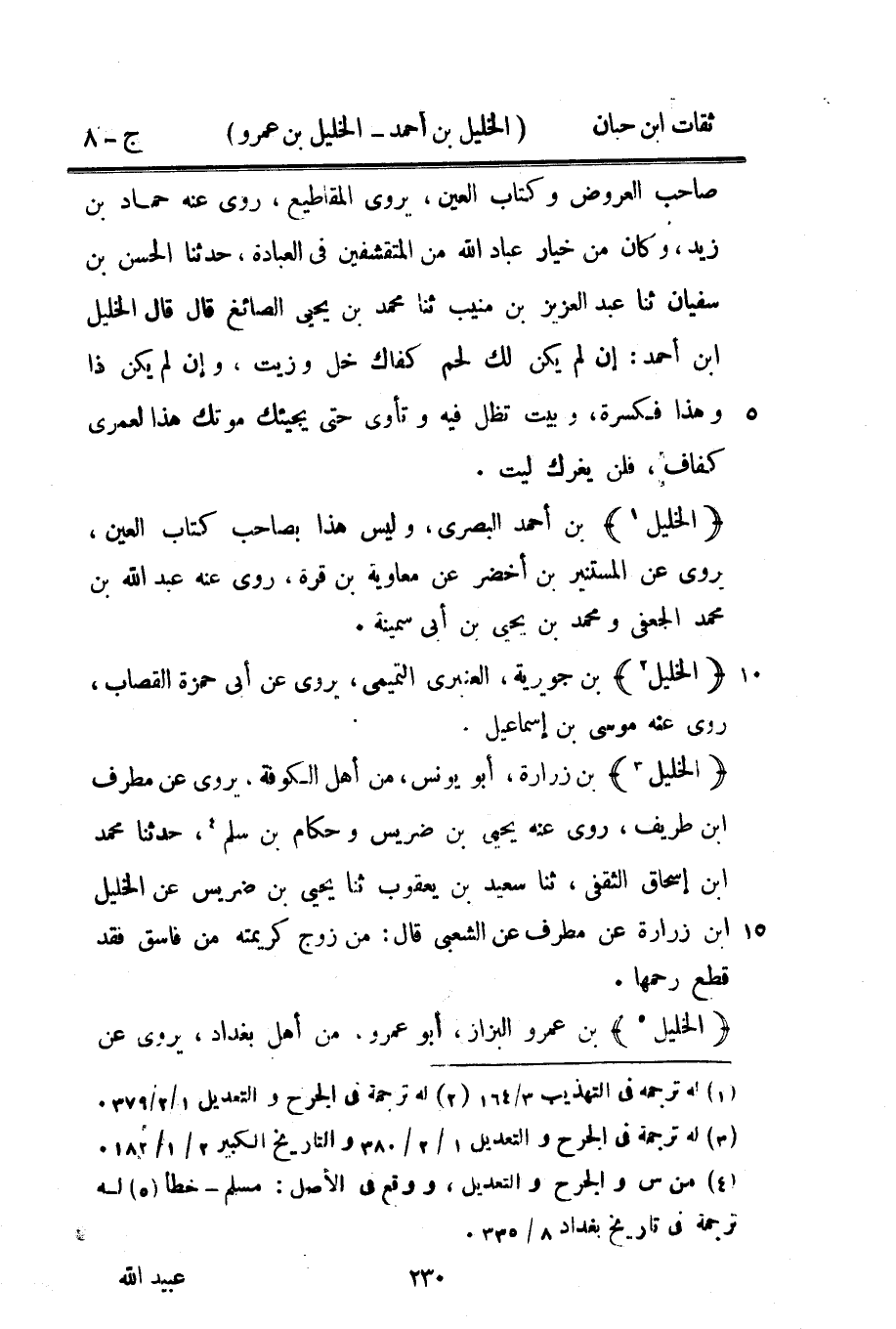 صَاحب الْعرُوض وَكتاب الْعين يروي المقاطيع روى عَنهُ حَمَّاد بن زيد وَكَانَ من خِيَار عباد الله من المتقشفين فِي الْعِبَادَة حَدَّثَنَا الْحَسَنُ بْنُ سُفْيَانَ ثَنَا عبد الْعَزِيز بن منيب ثَنَا مُحَمَّد بن يحيى الصَّائِغ قَالَ قَالَ الْخَلِيل بن أَحْمد إِن لم يكن لَك لحم كَفاك خل وزيت وَإِن لم يكن ذَا وَهَذَا فكسرة وَبَيت تظل فِيهِ وتأوي حَتَّى يجيئك موتك هَذَا لعمري كفاف فَلَنْ يغرك لَيْت