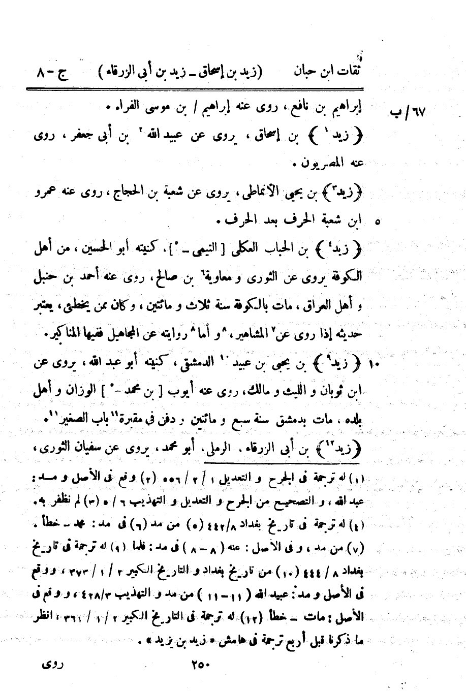 13277 - زيد بن الْحباب العكلي التَّيْمِيّ كنيته أَبُو الْحُسَيْن من أهل الْكُوفَة يروي عَن الثَّوْريّ وَمُعَاوِيَة بن صَالح روى عَنهُ أَحْمد بن حَنْبَل وَأهل الْعرَاق مَاتَ بِالْكُوفَةِ سنة ثَلَاث وَمِائَتَيْنِ وَكَانَ مِمَّن يخطىء يعْتَبر حَدِيثه إِذا روى عَنْ الْمَشَاهِير وَأما رِوَايَته عَن المجاهيل فَفِيهَا الْمَنَاكِير