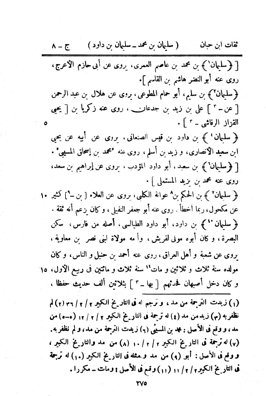 13423 - سُلَيْمَان بن دَاوُد أَبُو دَاوُد الطَّيَالِسِيّ أَصله من فَارس سكن الْبَصْرَة وَكَانَ أَبوهُ مولى لقريش وَأمه مولاة لبنى نصر بن مُعَاوِيَة يروي عَن شُعْبَة وَأهل الْعرَاق روى عَنهُ أَحْمد بن حَنْبَل وَالنَّاس وَكَانَ مولده سنة ثَلَاث وَثَلَاثِينَ وَمَات سنة ثَلَاث وَمِائَتَيْنِ فِي ربيع الأول وَكَانَ دخل أَصْبَهَان فَحَدثهُمْ بهَا بِثَلَاثِينَ ألف حَدِيث حفظا