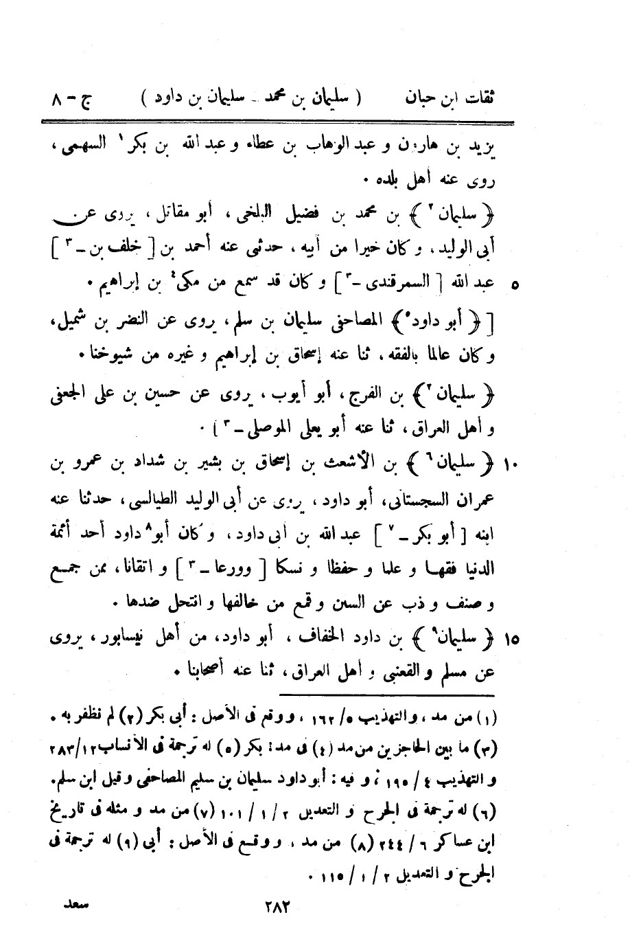 13458 - سُلَيْمَان بن الْأَشْعَث بن إِسْحَاق بن بشير بن شَدَّاد بن عَمْرو بن عمرَان السجسْتانِي أَبُو دَاوُد يروي عَن أبي الْوَلِيد الطَّيَالِسِيّ حَدَّثنا عَنهُ ابْنه أَبُو بكر عبد الله بن أبي دَاوُد وَكَانَ أَبُو دَاوُد أحد أَئِمَّة الدُّنْيَا فقها وعلما وحفظا ونسكا وورعا وإتقانا مِمَّن جمع وصنف وذب عَن السّنَن وقمع من خالفها وَانْتَحَلَ ضدها