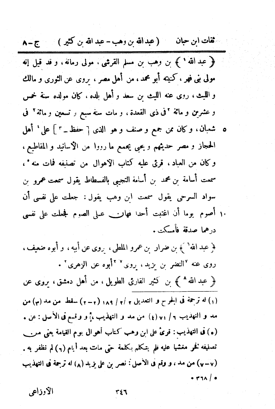 13802 - عَبْد اللَّه بْن وهب بْن مُسلم الْقرشِي مولى رمانة وَقد قيل إِنَّه مولى بنى فهر كنيته أَبُو مُحَمَّد من أهل مصر يروي عَن الثَّوْريّ وَمَالك وَاللَّيْث روى عَنهُ اللَّيْث بن سعد وَأهل بَلَده كَانَ مولده سنة خمس وَعشْرين وَمِائَة فِي ذِي الْقعدَة وَمَات سنة سبع وَتِسْعين وَمِائَة فِي شعْبَان وَكَانَ مِمَّن جمع وصنف وَهُوَ الَّذِي حفظ على أهل الْحجاز ومصر حَدِيثهمْ وَيحيى يجمع مَا رووا من الْأَسَانِيد والمقاطيع وَكَانَ من الْعباد قرئَ عَلَيْهِ كتاب الْأَهْوَال من تصنيفه فَمَاتَ مِنْهُ سَمِعت أُسَامَة بن مُحَمَّد بن أُسَامَة التجِيبِي بالفسطاط يَقُول سَمِعت عَمْرو بن سَواد السرحي يَقُول سَمِعت بن وهب يَقُول جعلت على نَفسِي أَن أَصوم يَوْمًا إِن أغتبت أحدا فهان على الصَّوْم فَجعلت على نَفسِي درهما صَدَقَة فَأَمْسَكت