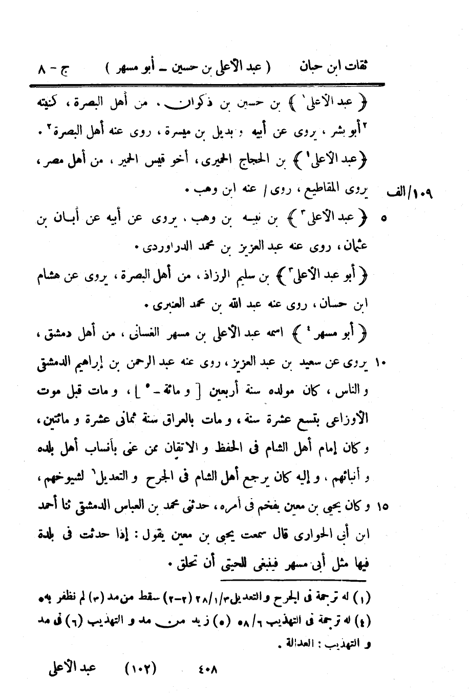 14130 - أَبُو مسْهر اسْمه عبد الْأَعْلَى بن مسْهر الغساني من أهل دمشق يروي عَن سعيد بن عبد الْعَزِيز روى عَنْهُ عبد الرَّحْمَن بن إِبْرَاهِيم الدِّمَشْقِي وَالنَّاس كَانَ مولده سنة أَرْبَعِينَ وَمِائَة وَمَات قبل موت الْأَوْزَاعِيّ بتسع عشرَة سنة وَمَات بالعراق سنة ثَمَانِي عشرَة وَمِائَتَيْنِ وَكَانَ إِمَام أهل الشَّام فِي الْحِفْظ والإتقان مِمَّن عَنى بأنساب أهل بَلَده وأنبائهم وَإِلَيْهِ كَانَ يرجع أهل الشَّام فِي الْجرْح وَالتَّعْدِيل لشيوخهم وَكَانَ يحيى بن معِين يفخم فِي أمره حَدثنِي مُحَمَّد بن الْعَبَّاس الدِّمَشْقِي ثَنَا أَحْمد بن أبي الْحوَاري قَالَ سَمِعت يحيى بن معِين يَقُول إِذا حدثت فِي بَلْدَة فِيهَا مثل أبي مسْهر فَيَنْبَغِي للحيتي أَن تحلق
