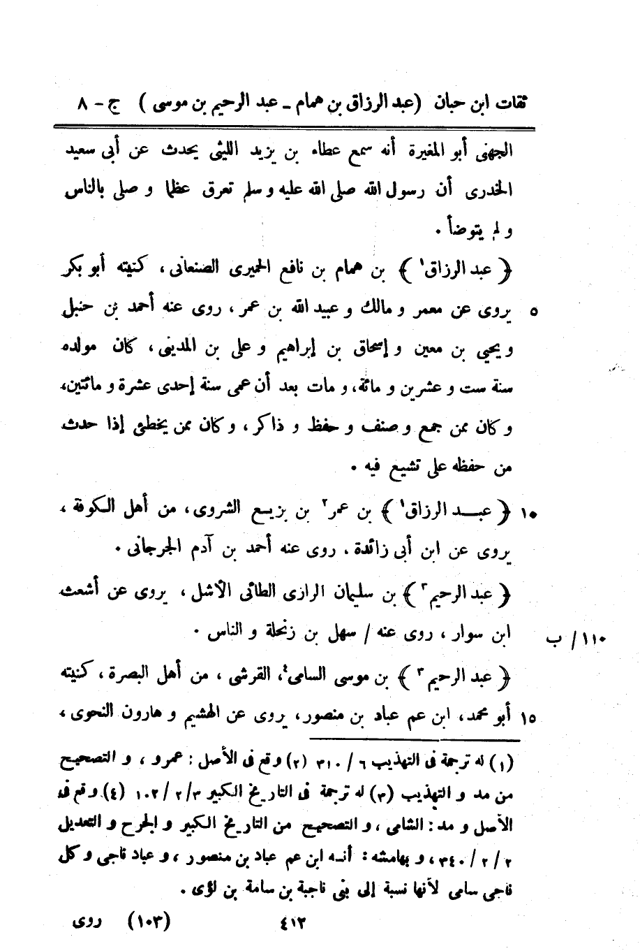 14146 - عبد الرَّزَّاق بن همام بن نَافِع الْحِمْيَرِي الصَّنْعَانِيّ كنيته أَبُو بكر يروي عَن معمر وَمَالك وَعبيد الله بْن عمر روى عَنهُ أَحْمد بن حَنْبَل وَيحيى بن معِين وَإِسْحَاق بن إِبْرَاهِيم وَعلي بن الْمَدِينِيّ كَانَ مولده سنة سِتّ وَعشْرين وَمِائَة وَمَات بعد أَن عمى سنة إِحْدَى عشرَة وَمِائَتَيْنِ وَكَانَ مِمَّن جمع وصنف وَحفظ وذاكر وَكَانَ مِمَّن يخطىء إِذا حدث من حفظه على تشيع فِيهِ