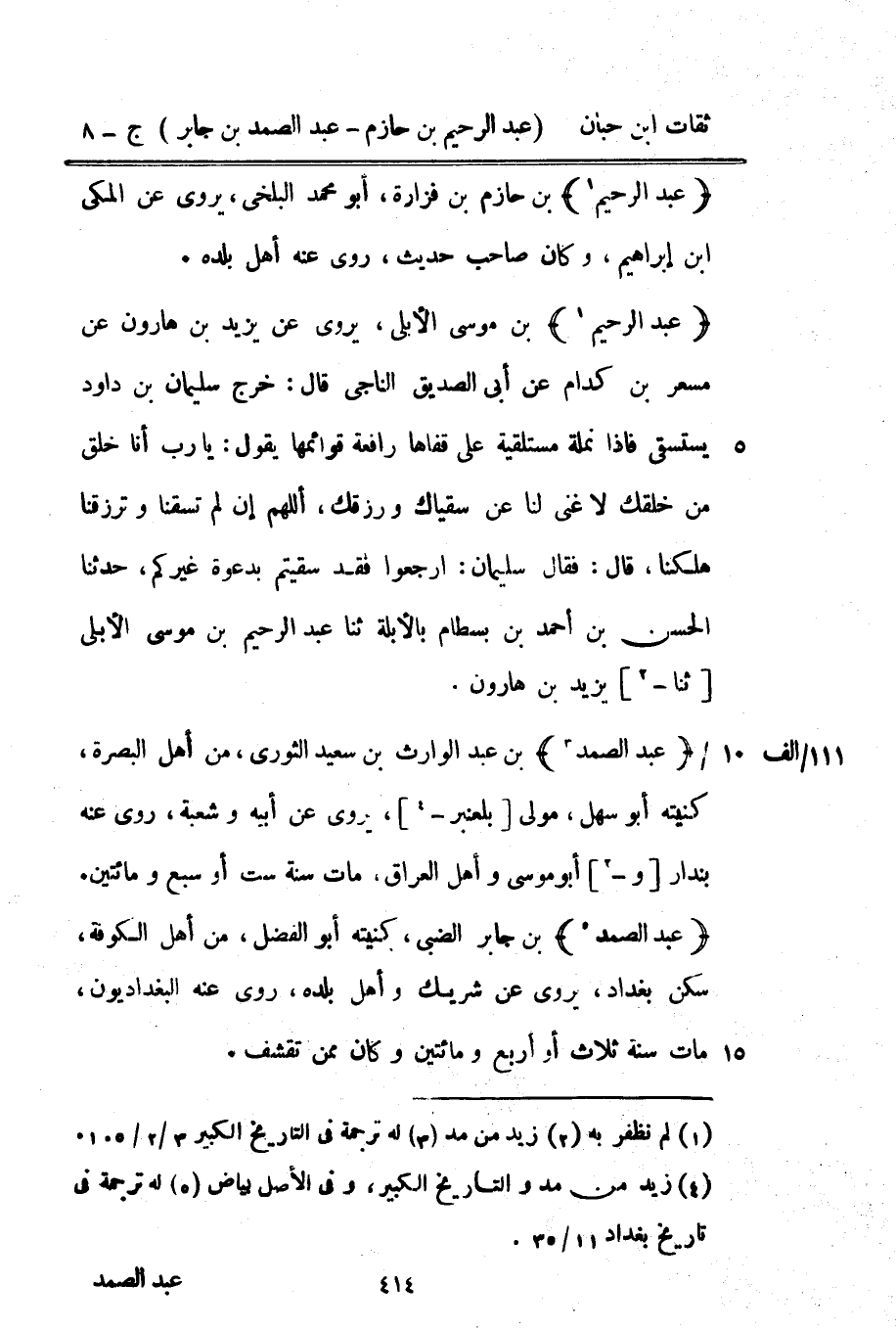 14156 - عبد الرَّحِيم بن مُوسَى الأبلى يروي عَن يزِيد بن هَارُون عَن مسعر بن كدام عَن أبي الصّديق النَّاجِي قَالَ خرج سُلَيْمَان بن دَاوُد يستسقى فَإِذا نملة مستلقية على قفاها رَافِعَة قَوَائِمهَا يَقُول يَا رب أَنا خلق من خلقك لَا غنى لنا عَن سقياك ورزقك اللَّهُمَّ إِن لم تسقنا وترزقنا هلكنا قَالَ فَقَالَ سُلَيْمَان ارْجعُوا فقد سقيتم بدعوة غَيْركُمْ حَدَّثنا الْحسن بن أَحْمد بن بسطَام بالأبلة ثَنَا عبد الرَّحِيم بن مُوسَى الأبلى ثَنَا يزِيد بن هَارُون