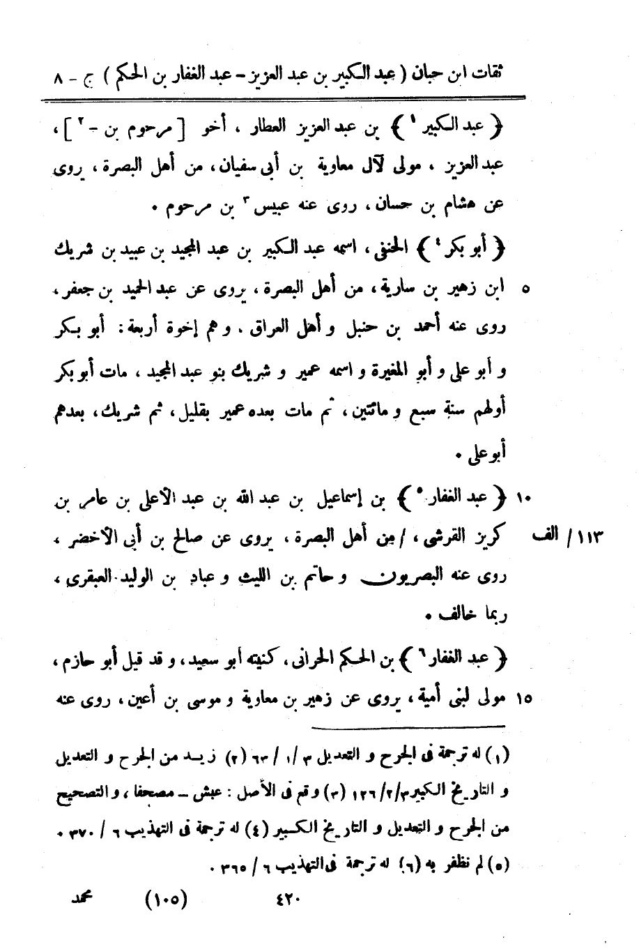 14189 - عبد الْكَبِير بن عبد الْعَزِيز الْعَطَّار أَخُو مَرْحُوم بن عبد الْعَزِيز مولى لآل مُعَاوِيَة بن أبي سُفْيَان من أهل الْبَصْرَة يروي عَن هِشَام بن حسان روى عَنهُ عُبَيْس بن مَرْحُوم