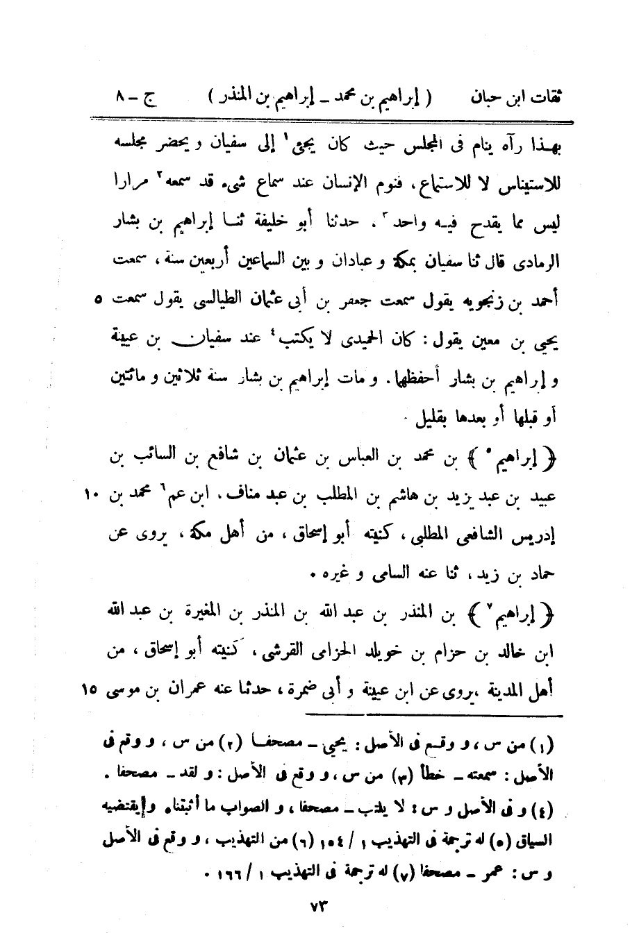 بِهَذَا رَآهُ ينَام فِي الْمجْلس حَيْثُ كَانَ يجىء إِلَى سُفْيَان ويحضر مَجْلِسه للاستيناس لَا للاستماع فنوم الْإِنْسَان عِنْد سَماع شَيْء قد سَمعه مرَارًا لَيْسَ مِمَّا يقْدَح فِيهِ وَاحِد حَدَّثنا أَبُو خَليفَة ثَنَا إِبْرَاهِيم بن بشار الرَّمَادِي قَالَ ثَنَا سُفْيَان بِمَكَّة وعبادان وَبَين السماعين أَرْبَعِينَ سنة سَمِعت أَحْمد بن زَنْجوَيْه يَقُول سَمِعت جَعْفَر بن أبي عُثْمَان الطَّيَالِسِيّ يَقُول سَمِعت يَحْيَى بْن معِين يَقُول كَانَ الْحميدِي لَا يكْتب عِنْد سُفْيَان بن عُيَيْنَة وَإِبْرَاهِيم بن بشار أحفظهما وَمَات إِبْرَاهِيم بن بشار سنة ثَلَاثِينَ وَمِائَتَيْنِ أَو قبلهَا أَو بعْدهَا بِقَلِيل