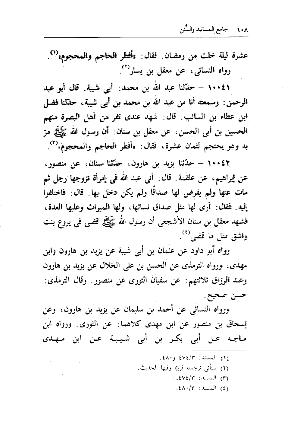 10041 - حدثنا عبد الله بن محمد: أبى شيبة. قال أبو عبد الرحمن: وسمعته أنا من عبد الله بن محمد بن أبى شيبة، حدثنا فضل ابن عطاء بن السائب. قال: شهد عندى نفر من أهل البصرة منهم الحسيين بن أبى الحسن، عن معقل بن سنان: أن رسول الله - صلى الله عليه وسلم - مر به وهو يحتجم لثمان عشرة، فقال: «أفطر الحاجم والمحجوم» (¬1) .