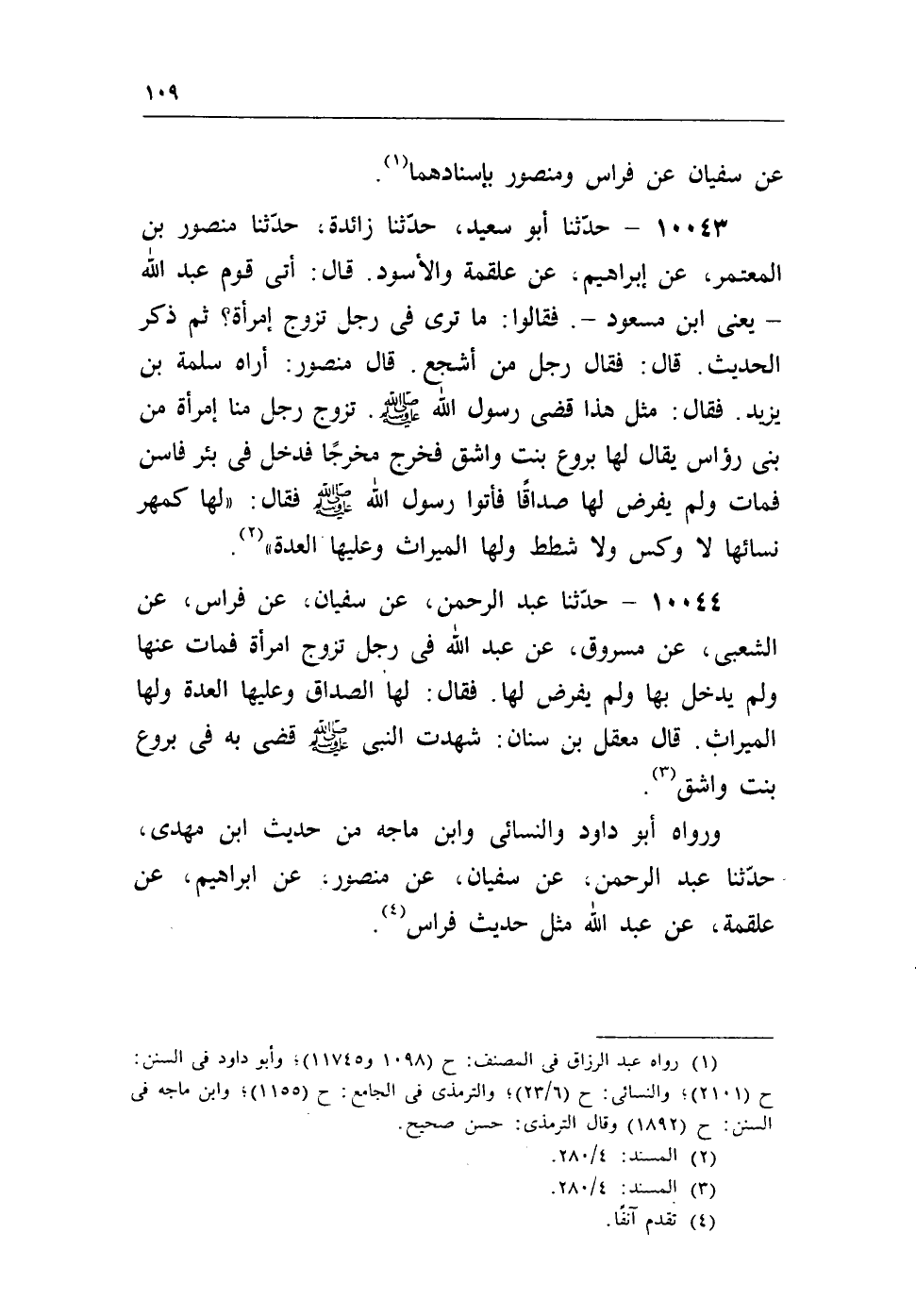10043 - حدثنا أبو سعيد، حدثنا زائدة، حدثنا منصور بن المعتمر، عن إبراهيم، عن علقمة والأسود. قال: أتى قوم عبد الله - يعنى ابن مسعود-. فقالوا: ما ترى فى رجل تزوج إمراة؟ ثم ذكر الحديث. قال: فقال رجل من أشجع. قال منصور: أراه سلمة بن يزيد. فقال: مثل هذا قضى رسول الله - صلى الله عليه وسلم -. تزوج رجل منا إمرأة من بنى رؤاس يقال لها بروع بنت واشق فخرج مخرجا فدخل فى بئر فاسن فمات ولم يفرض لها صداقا فأتوا رسول الله - صلى الله عليه وسلم - فقال: «لها كمهر نسائها لا وكس ولا شطط ولها الميراث وعليها العدة» (¬1) .