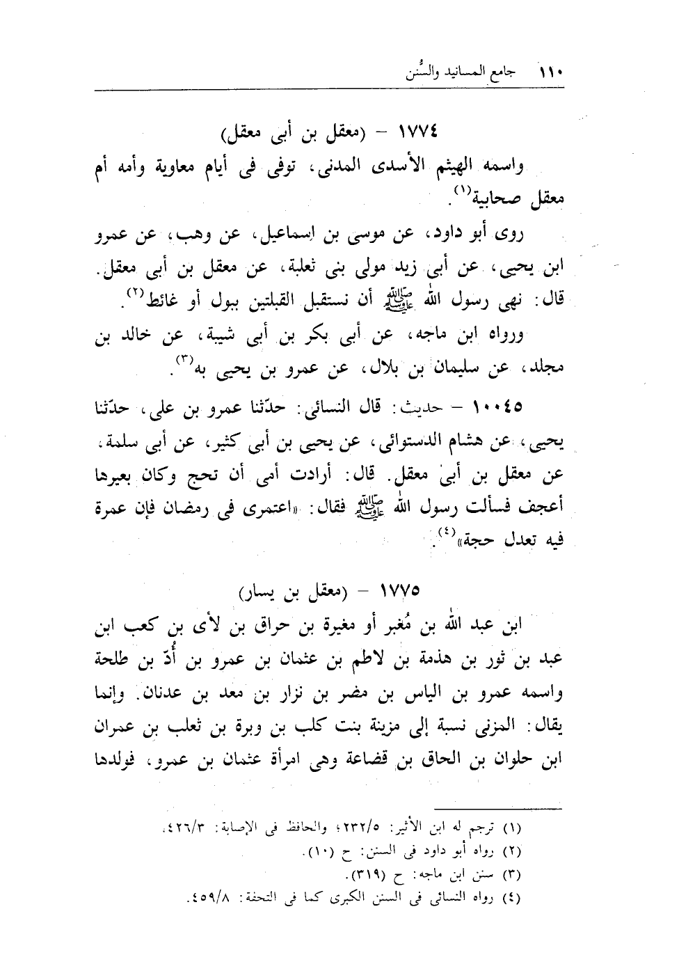 10045 - حديث: قال النسائى: حدثنا عمرو بن على، حدثنا يحيى، عن هشام الدستوائى، عن يحيى بن أبى كثير، عن أبى سلمة، عن معقل بن أبى معقل. قال: أرادت أمى أن تحج وكان بعيرها أعجف فسألت رسول الله - صلى الله عليه وسلم - فقال: «اعتمرى فى رمضان فإن عمرة فيه تعدل حجة» (¬4) .