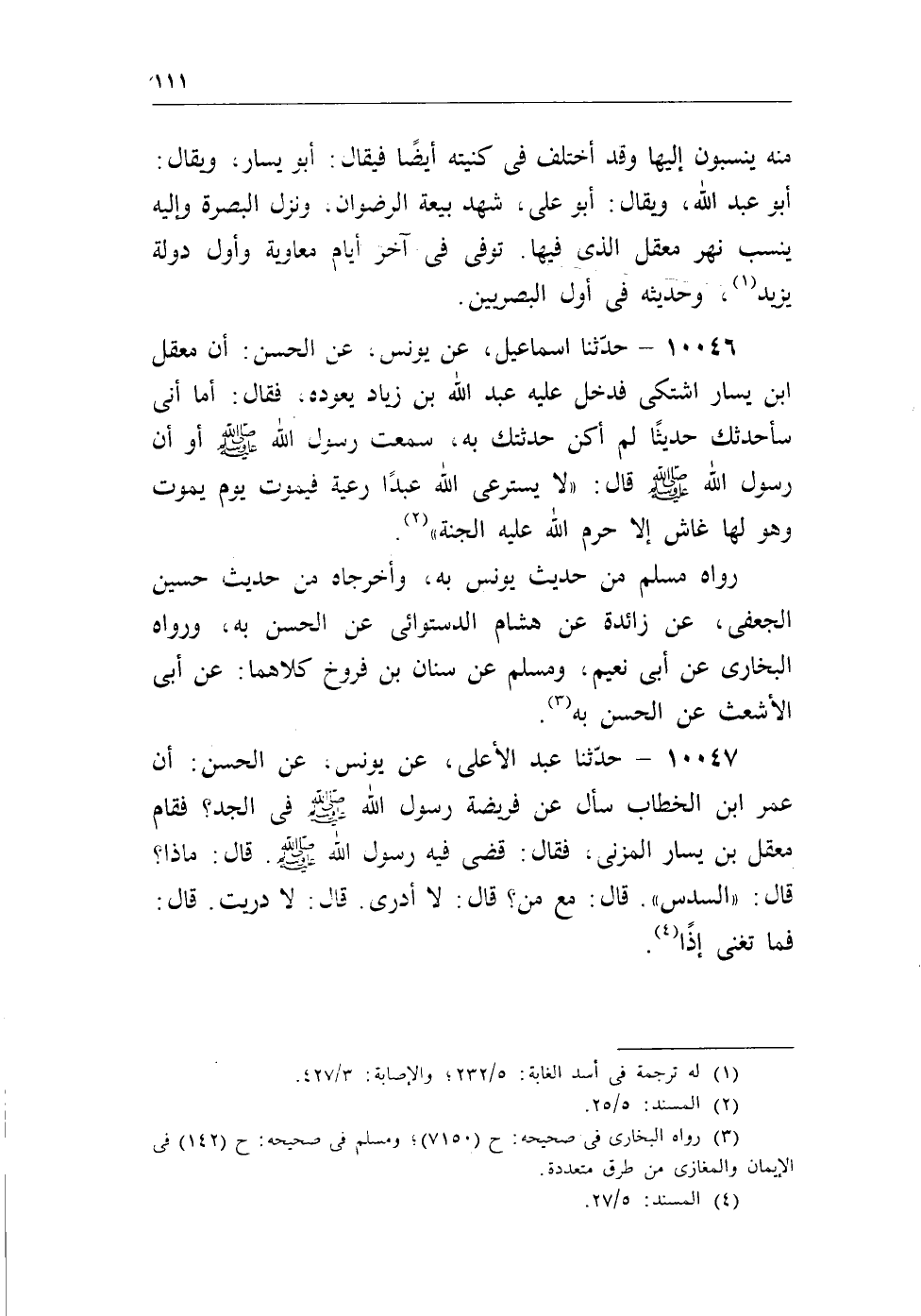 منه ينسبون إليها وقد اختلف فى كنيته أيضا فيقال: أبو يسار، ويقال: أبو عبد الله، ويقال: أبو على، شهد بيعة الرضوان، ونزل البصرة وإليه ينسب نهر معقل الذى فيها. توفى فى آخر أيام معاوية أول دولة يزيد (¬1) ، وحديثه فى أول البصريين.