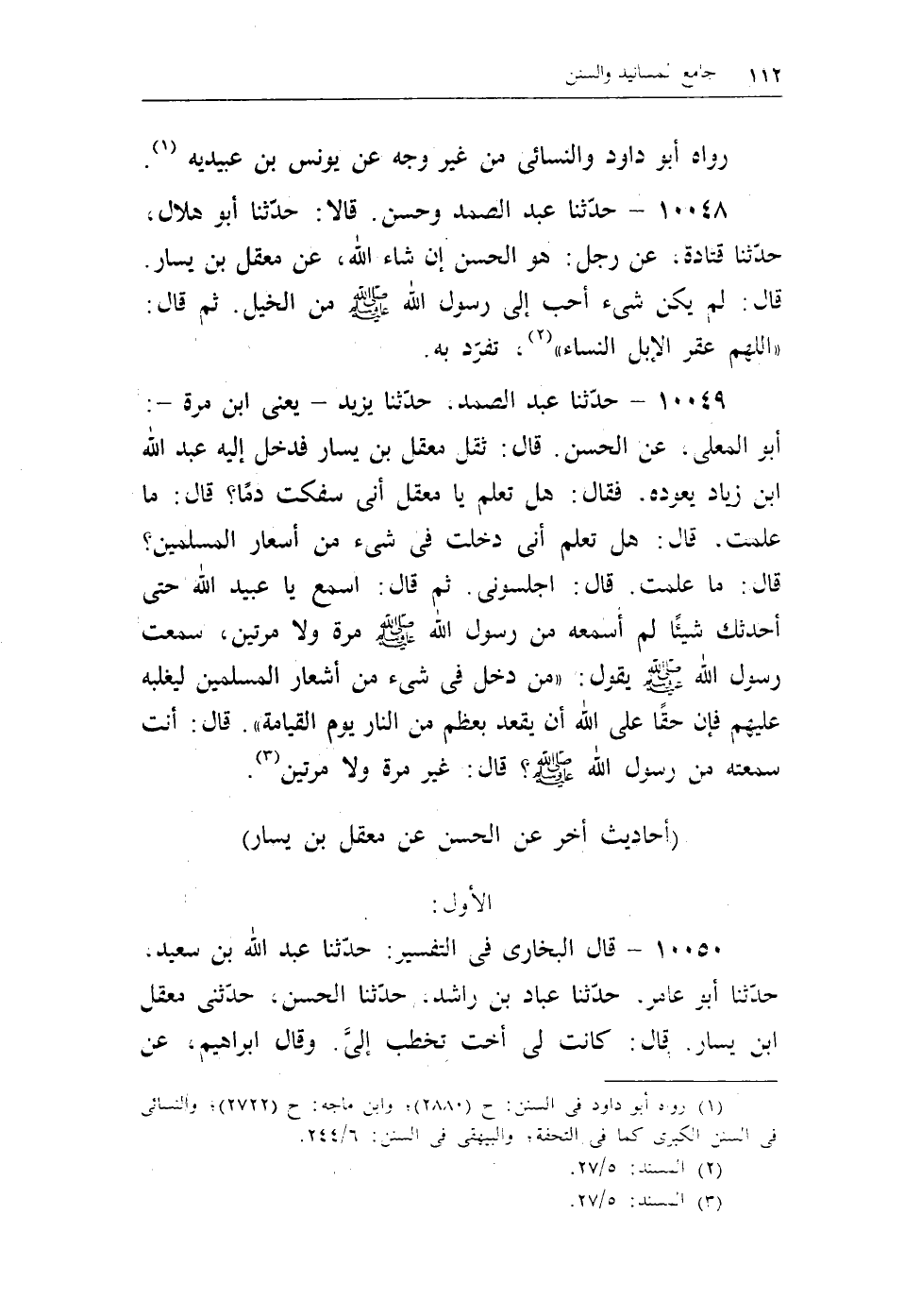 10048 - حدثنا عبد الصمد وحسن. قالا: حدثنا أبو هلال، حدثنا قتادة، عن رجل: هو الحسن إن شاء الله، عن معقل بن يسار. قال: لم يكن شىء أحب إلى رسول الله - صلى الله عليه وسلم - من الخيل. ثم قال: «اللهم عقر الإبل النساء» (¬1) ، تفرد به.