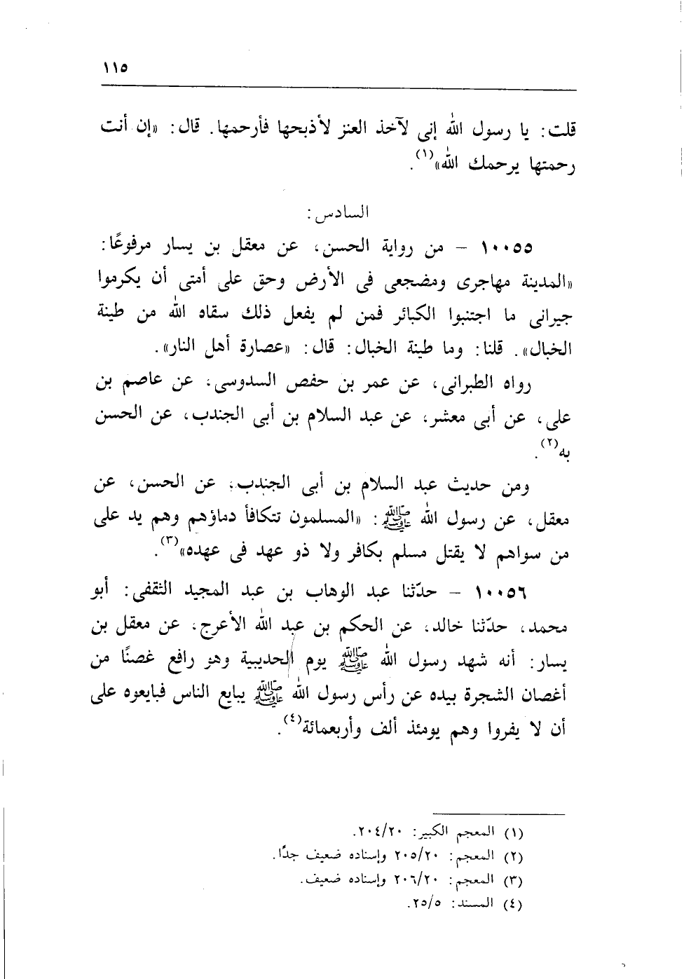 10055 - من رواية الحسن، عن معقل بن يسار مرفوعا: «المدينة مهاجرى ومضجعى فى الأرض وحق على أمتى أن يكرموا جيرانى ما اجتنبوا الكبائر فمن لم يفعل ذلك سقاه الله من طينة الخبال» . قلنا: وما طينة الخبال: قال: «عصارة أهل النار» .