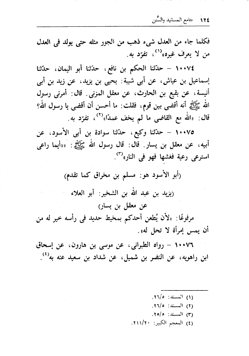 10074 - حدثنا الحكم بن نافع، حدثنا أبو اليمان، حدثنا إسماعيل بن عياش، عن أبى شيبة: يحيى بن يزيد، عن زيد بن أبى أنيسة، عن بقيع بن الحارث، عن معقل المزنى. قال: أمرنى رسول الله - صلى الله عليه وسلم - أنى أقضى بين قوم، فقلت: ما أحسسن أن أقضى يا رسول الله؟ قال: «الله مع القاضى ما لم يخف عمدا» (¬1) ، تفرد به.