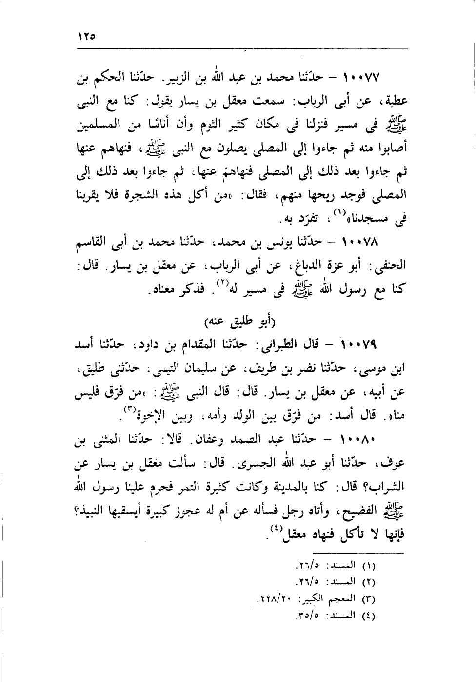 10077 - حدثنا محمد بن عبد الله بن الزبير، حدثنا الحكم بن عطية، عن أبى الرباب: سمعت معقل بن يسار يقول: كنا مع النبى - صلى الله عليه وسلم - فى مسير فنزلنا فى مكان الثوم وأن أناسا من المسلمين أصابوا منه ثم جاءوا إلى المصلى يصلون مع النبى - صلى الله عليه وسلم -، فنهاهم عنها ثم جاءوا بعد ذلك إلى المصلى فنهاهم عنها، ثم جاءوا بعد ذلك إلى المصلى فوجد ريحها منهم، فقال: «من أكل هذه الشجرة فلا يقربنا فى مسجدنا» (¬1) ، تفرد به.