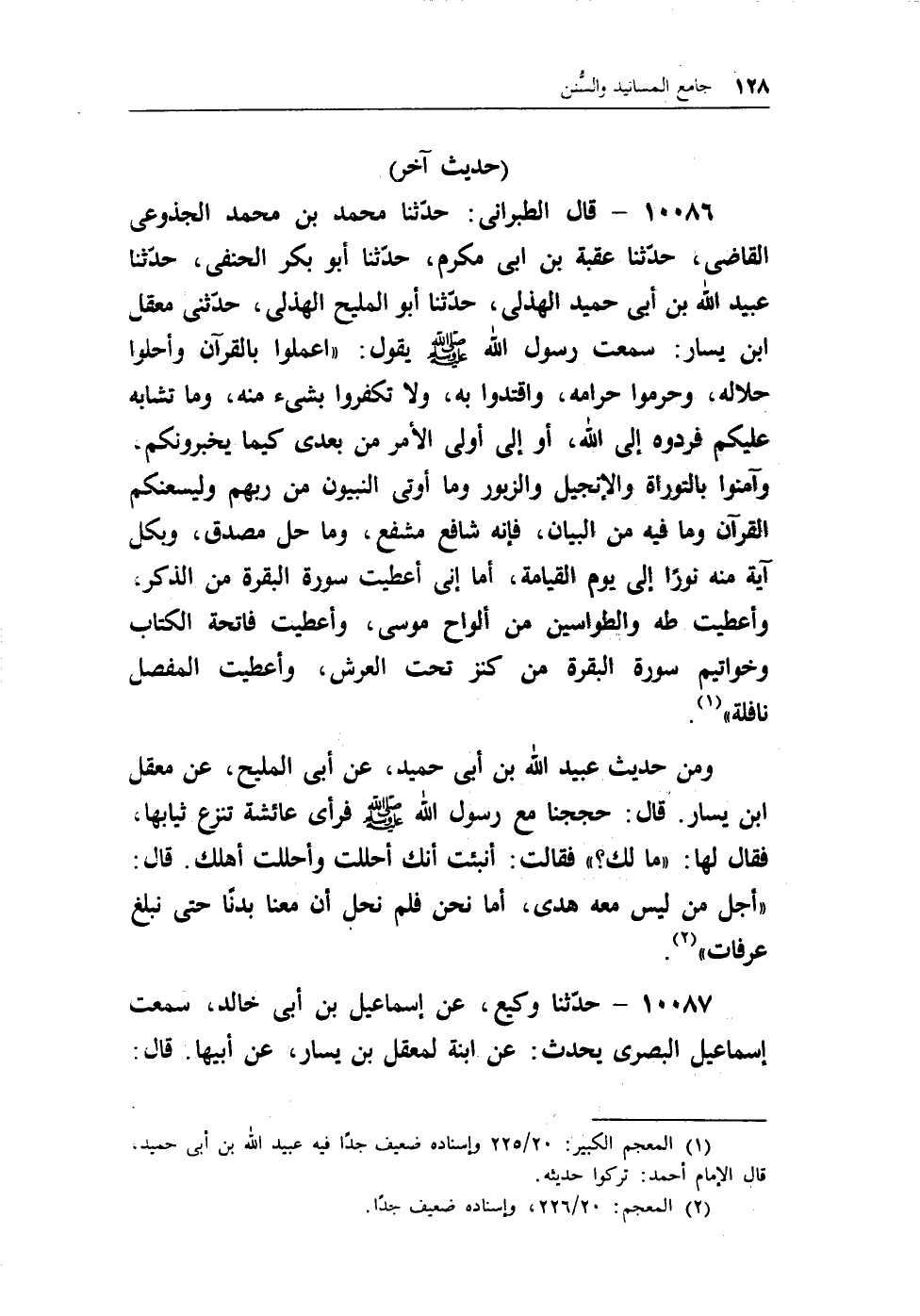 10086 - قال الطبرانى: حدثنا محمد بن محمد بن الجذوعى القاضى، حدثنا عقبة بن أبى مكرم، حدثنا أبو بكر الحنفى، حدثنا عبيد الله بن أبى حميد الهذلى، حدثنا أبو المليح الهذلى، حدثنى معقل ابن يسار: سمعت رسول الله - صلى الله عليه وسلم - يقول: «اعملوا القرآن وأحلوا حلاله، وحرموا حرامه، واقتدوا به، ولا تكفروا بشىء منه، وما تشابه عليكم فردوه إلى الله، أو إلى أولى الأمر من بعدى كيما يخبرونكم.