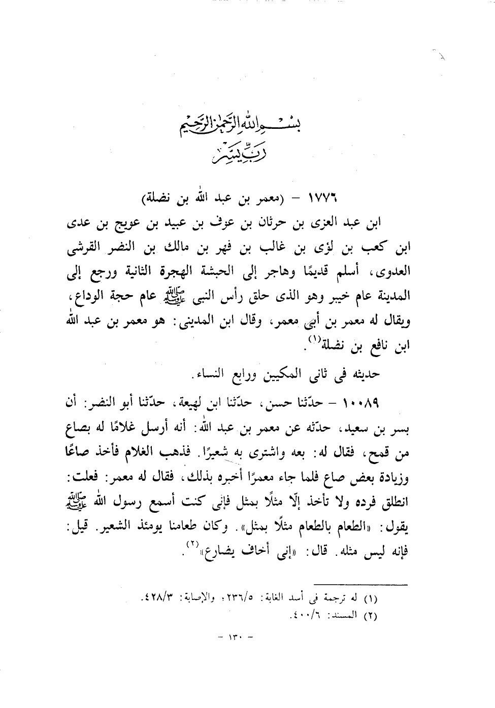 10089 - حدثنا حسن، حدثنا ابن لهيعة، حدثنا أبو النضر: أن بسر بن سعيد، حدثه عن معمر بن عبد الله: انه أرسل غلاما له بصاع من قمح، فقال له: بعه واشترى به شعيرا. فذهب الغلام فأخذ صاعا وزيادة بعض صاع فلما جاء معمرا أخبره بذلك، فقال له معمر: فعلت: انطلق فرده ولا تأخذ إلا مثلا بمثل فإنى كنت أسمع رسول الله - صلى الله عليه وسلم - يقول: «الطعام بالطعام مثل بمثل» . وكان طعامنا يومئذ الشعير. قيل: فإنه ليس مثله، قال: «إنى أخاف يضارع» (¬2) .