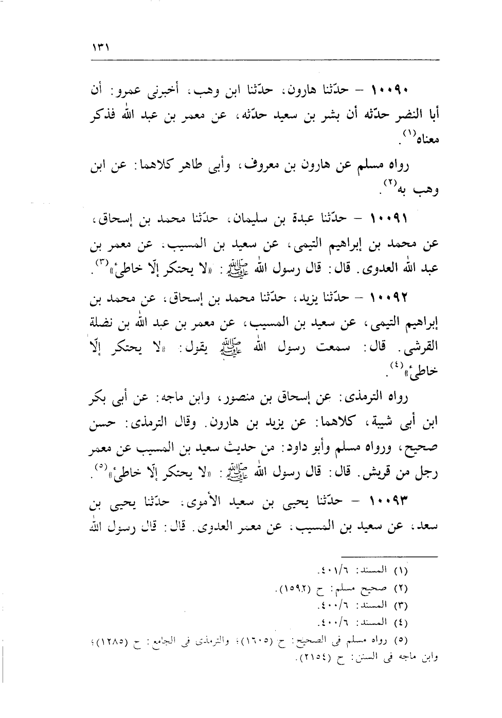 10093 - حدثنا يحيى بن سعيد الأموى، حدثنا يحيى بن سعد، عن سعيد بن المسيب، عن معمر العدوى. قال: قال رسول الله