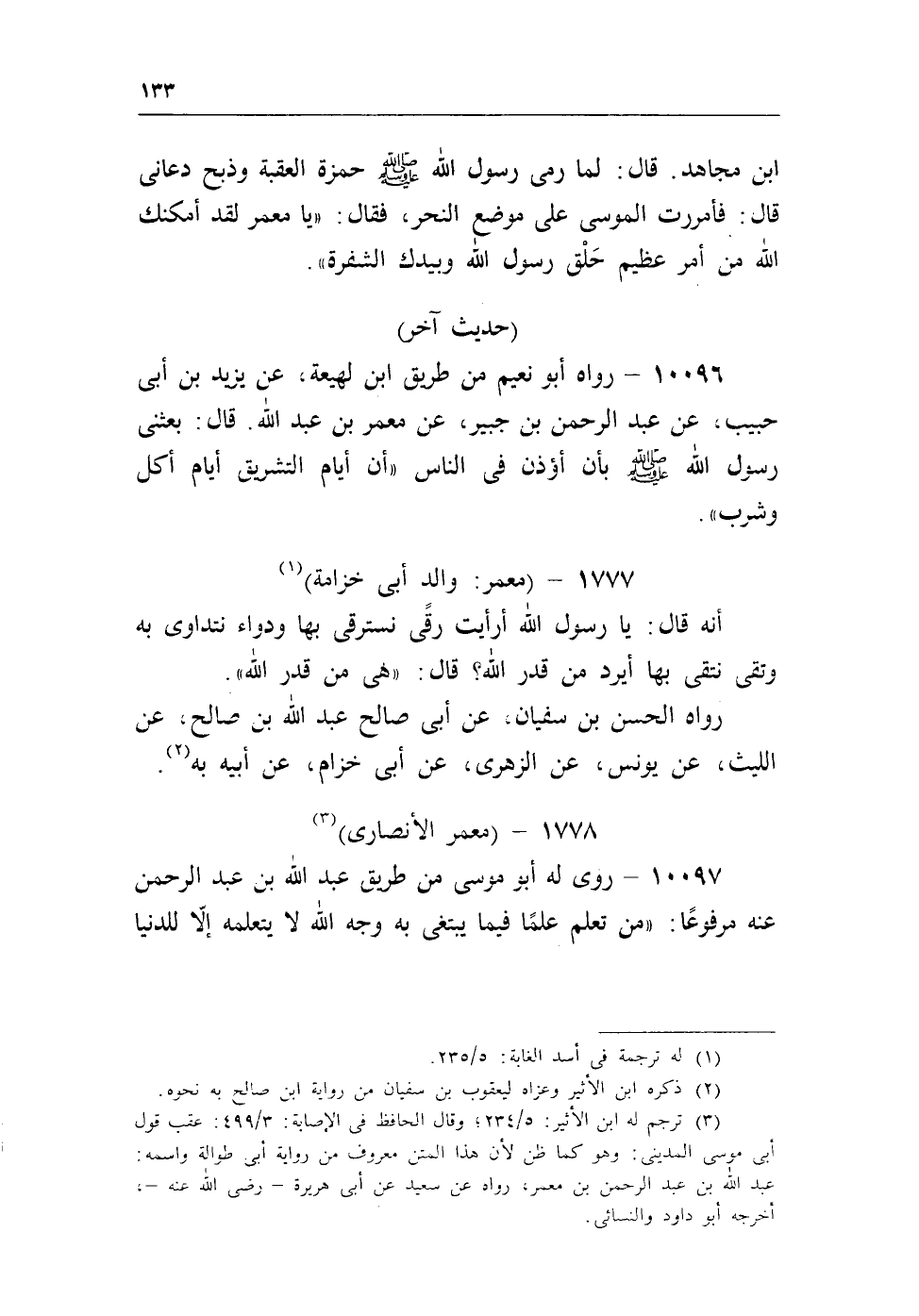 بن مجاهد. قال: لما رمى رسول الله - صلى الله عليه وسلم - حمزة العقبة وذبح دعانى قال: فأمررت الموسى على موضع النحر، فقال: «يا معمر لقد أمكنك الله من أمر عظيم حلق رسول الله وبيدك الشفرة» .