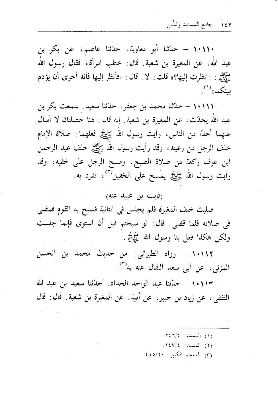 10111 - حدثنا محمد بن جعفر، حدثنا سعيد، سمعت بكر بن عبد الله يحدث، عن المغيرة بن شعبة، إنه قال: هنا خصلتان لا أسأل عنهما أحدا من الناس، رأيت رسول الله - صلى الله عليه وسلم - فعلهما: صلاة الإمام خلف الرجل من رعيته، وقد رأيت رسول الله - صلى الله عليه وسلم - خلف عبد الرحمن بن عوف ركعة من صلاة الصبح، ومسح الرجل عل خفيه، وقد رأيت رسول الله - صلى الله عليه وسلم - يمسح على الخفين (¬2) ، تفرد به.