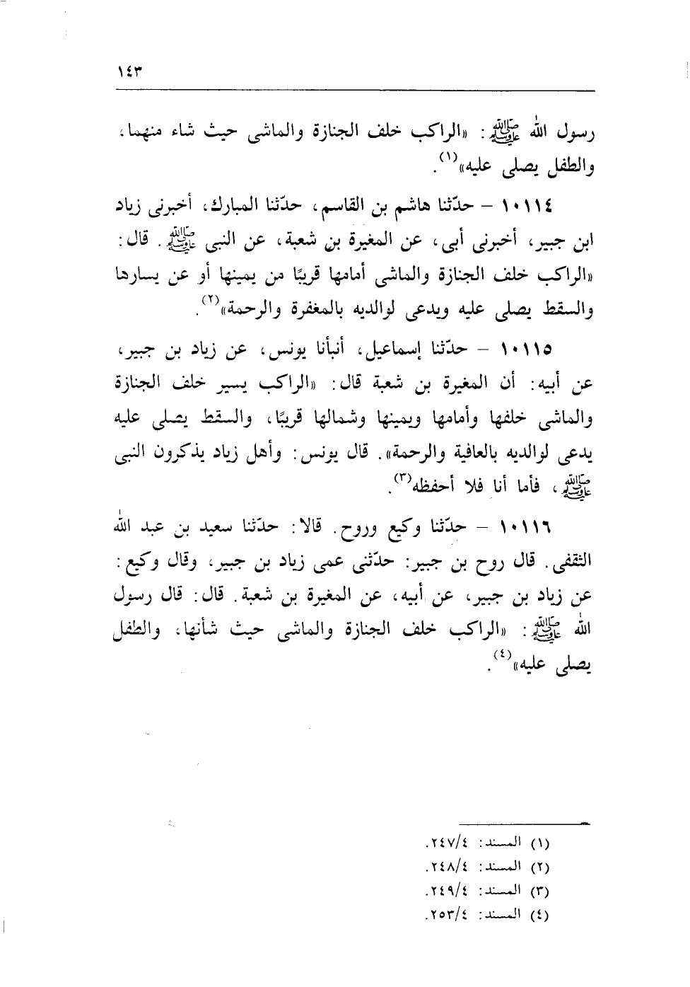 10116 - حدثنا وكيع وروح. قالا: حدثنا سعيد بن عبد الله الثقفى. قال روح بن جبير: حدثنى عمى زياد بن جبير، وقال وكيع: عن زياد بن جبير، عن أبيه، عن المغيرة بن شعبة. قال: قال رسول الله - صلى الله عليه وسلم -: «الراكب خلف الجنازة والماشى حيث شأنها، والطفل يصلى عليه» (¬3) .