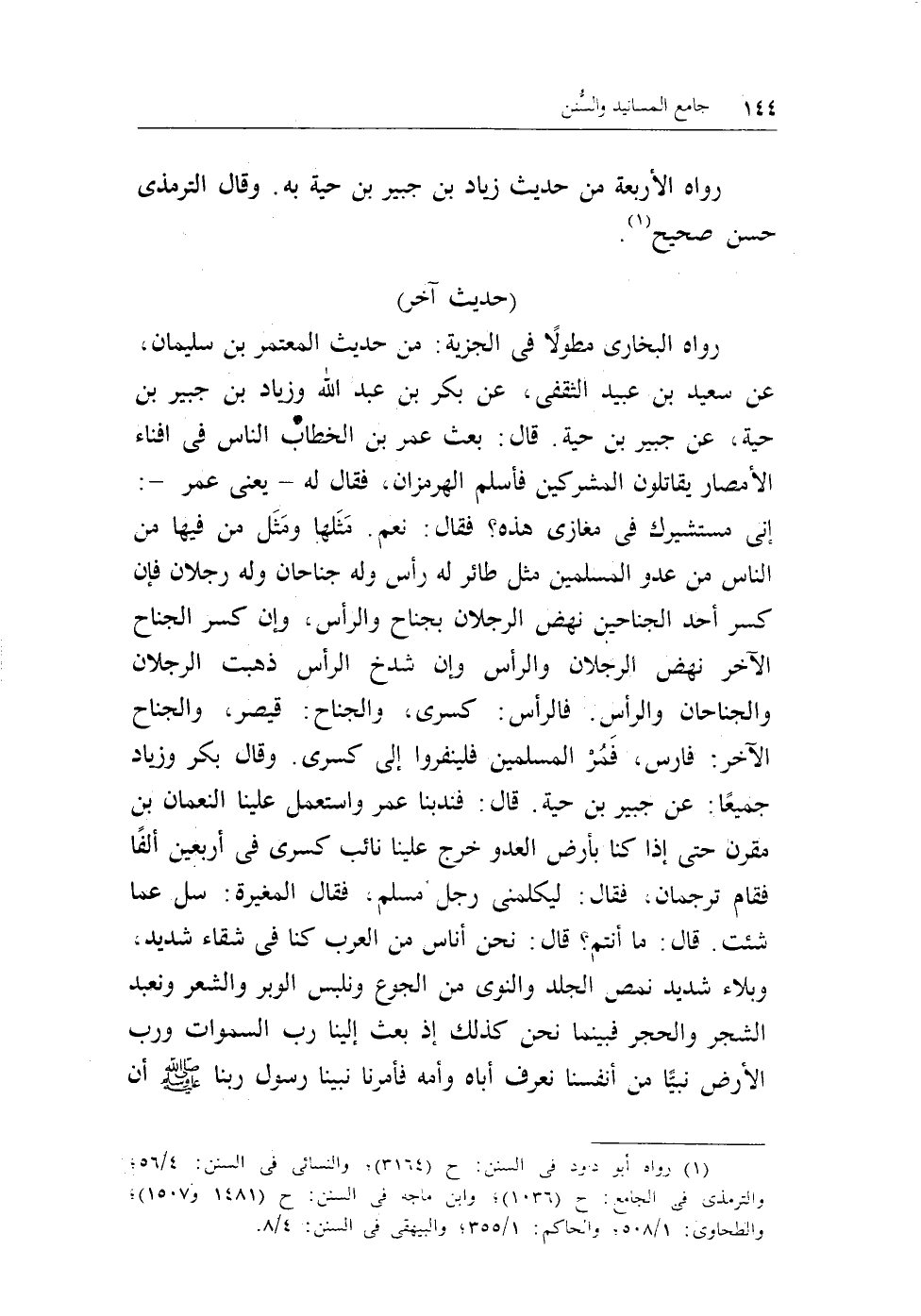رواه البخارى مطولا فى الجزية: من حديث المعتمر بن سليمان عن سعيد بن عبد الثقفى، عن بكر بن عبد الله وزياد بن جبير بن حية، عن جبير بن حية. قال: بعث عمر بن الخطاب الناس فى افناء الأمطار يقاتلون المشركين فأسلم الهرمزان، فقال له- يعنى عمر-: