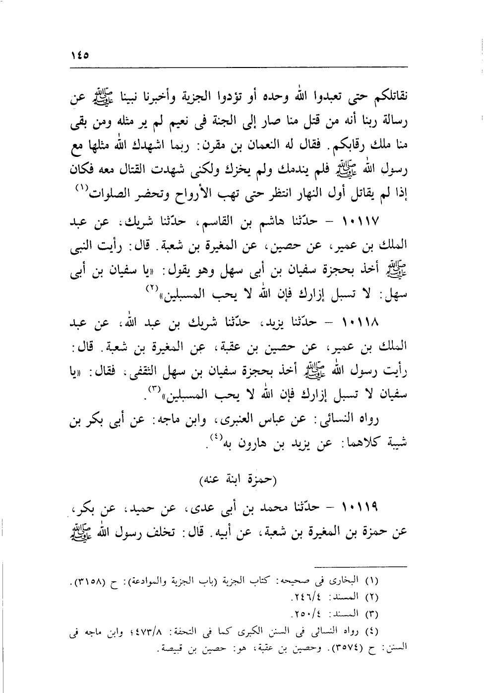 10118 - حدثنا يزيد، حدثنا شريك بن عبد الله، عن عبد الملك بن عمير، عن حصين بن عقبة، عن المغيرة بن شعبة. قال: رأيت رسول الله - صلى الله عليه وسلم - أخذ بحجزة سفيان بن سهل الثقفى، فقال: «يا سفيان لا تسبل إزارك فإن الله لا يحب المسبلين» (¬2) .