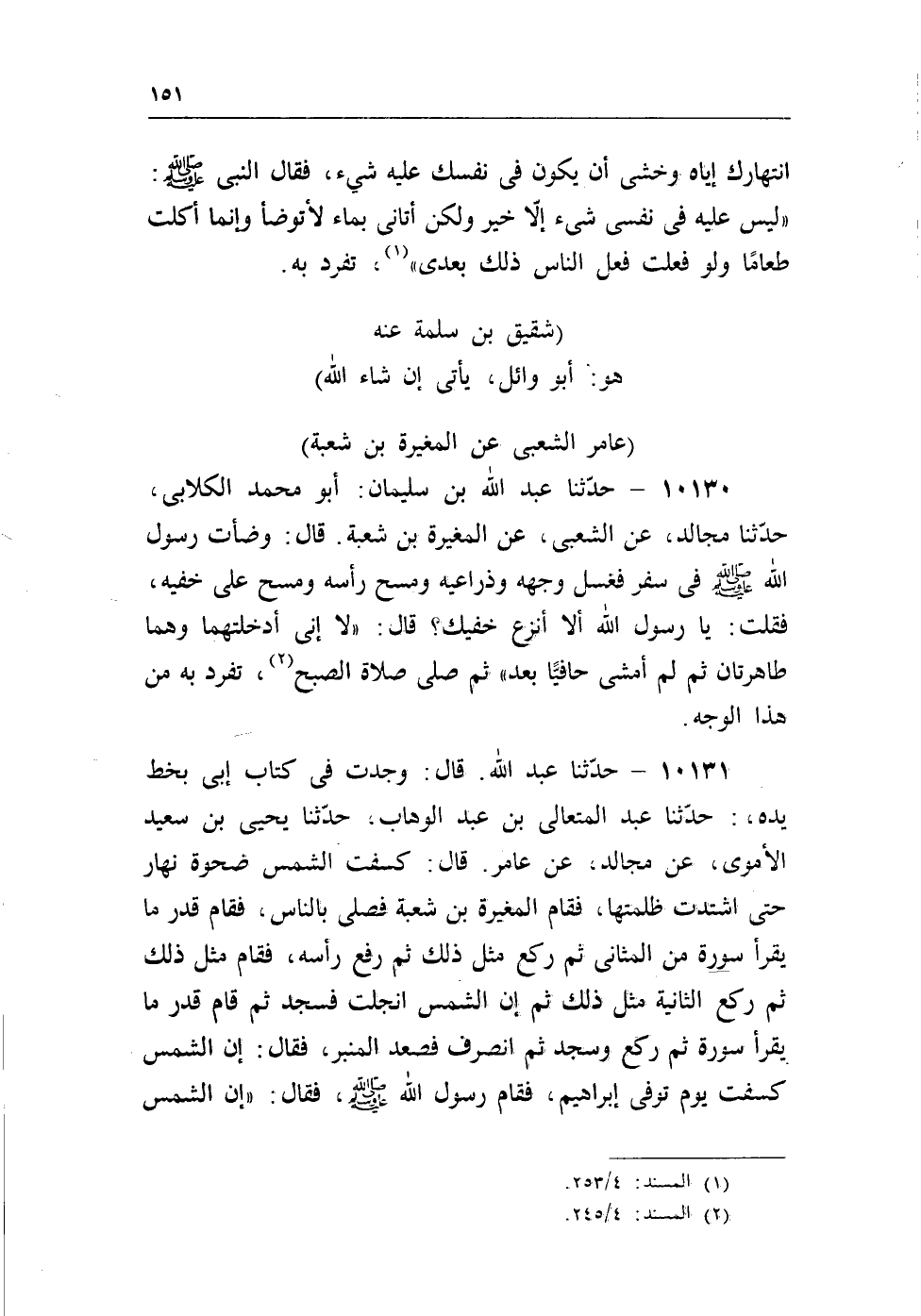 10130 - حدثنا عبد الله بن سليمان: أبو محمد الكلابى، حدثنا مجالد، عن الشعبى، عن المغيرة بن شعبة. قال: وضأت رسول الله - صلى الله عليه وسلم - فى سفر فغسل وجهه وذراعيه ومسح رأسه ومسح على خفيه، فقلت: يا رسول الله ألا أنزع خفيك؟ قال: «لا إنى أدخلتهما وهما طاهرتان ثم لم أمشى حافيا بعد» ثم صلى صلاة الصبح (¬1) ، تفرد به من هذا الوجه.