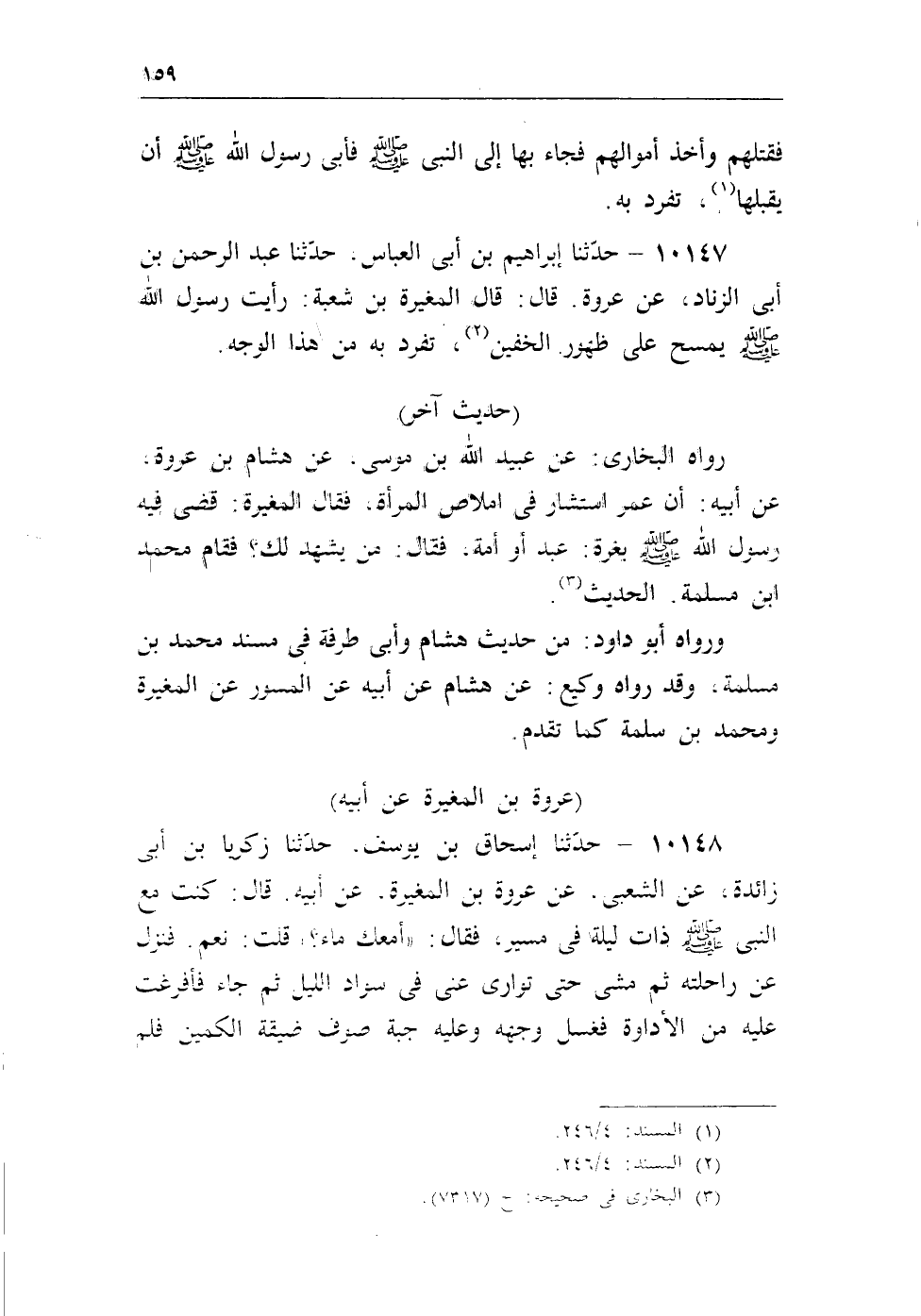 10147 - حدثنا إبراهيم بن أبى العباس، حدثنا عبد الرحمن بن أبى الزناد، عن عروة. قال: قال المغيرة بن شعبة: رأيت رسول الله - صلى الله عليه وسلم - يمسح على ظهور الخفين (¬1) ، تفرد به من هذا الوجه.