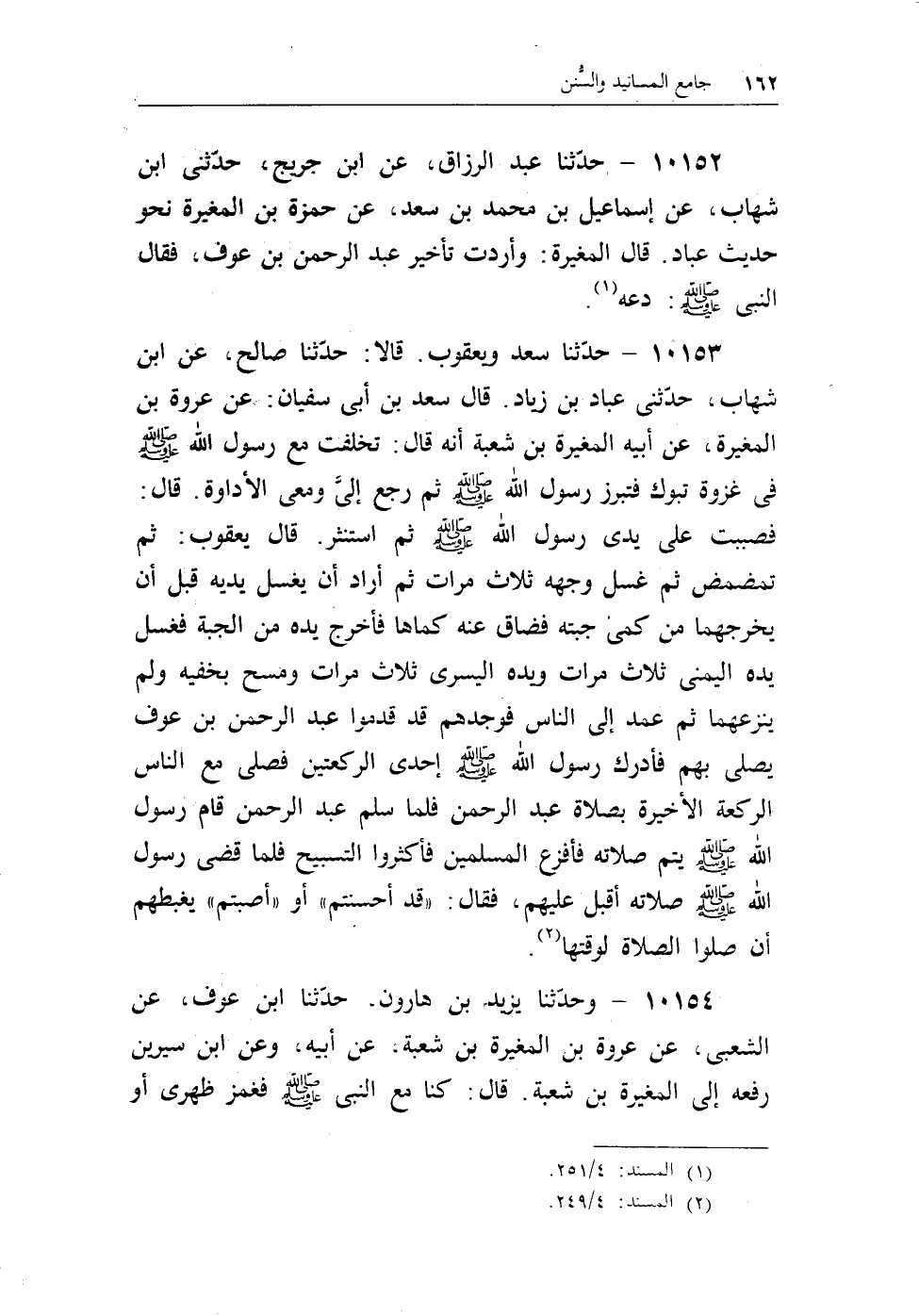 10152 - حدثنا عبد الرزاق، عن ابن جريج، حدثنى ابن شهاب، عن إسماعيل بن محمد بن سعد، عن حمزة بن المغيرة نحو حديث عباد. قال المغيرة: وأردت تأخير عبد الرحمن بن عوف، فقال النبى - صلى الله عليه وسلم -: دعه (¬1) .