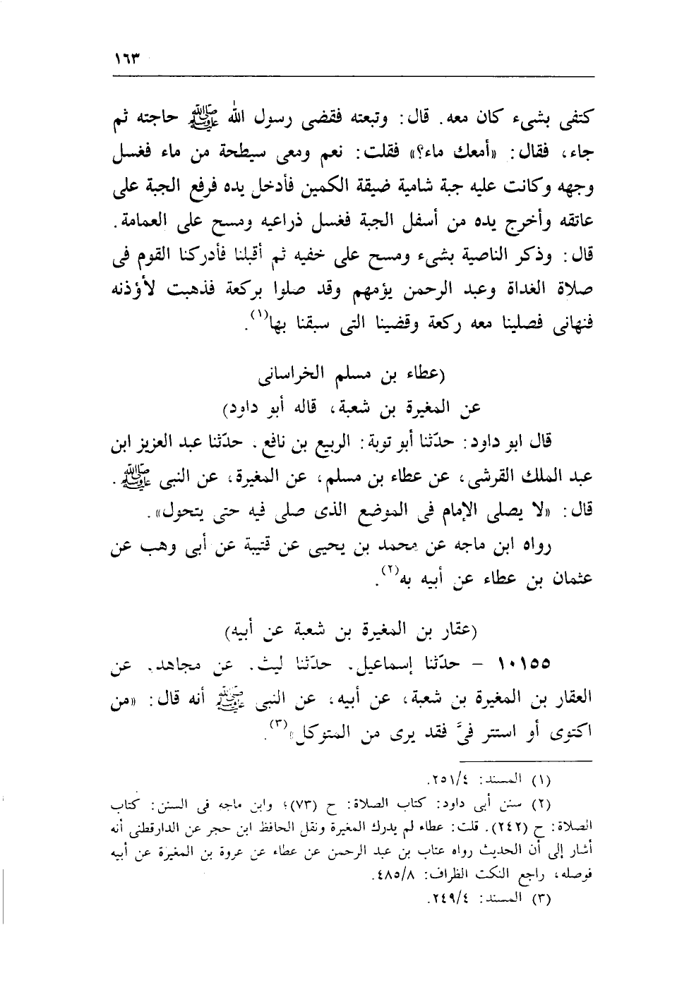 (¬2) سنن أبى داود: كتاب الصلاة: ح (73) ؛ وابن ماجه فى السنن: كتاب الصلاة: ح (242) . قلت: عطاء لم يدرك المغيرة ونقل الحافظ ابن حجر عن الدارقطنى أنه أشار إلى أن الحديث رواه عتاب بن عبد الرحمن عن عطاء عن عروة بن المغيرة عن أبيه فوصله، راجع النكت الظراف: 8/485.