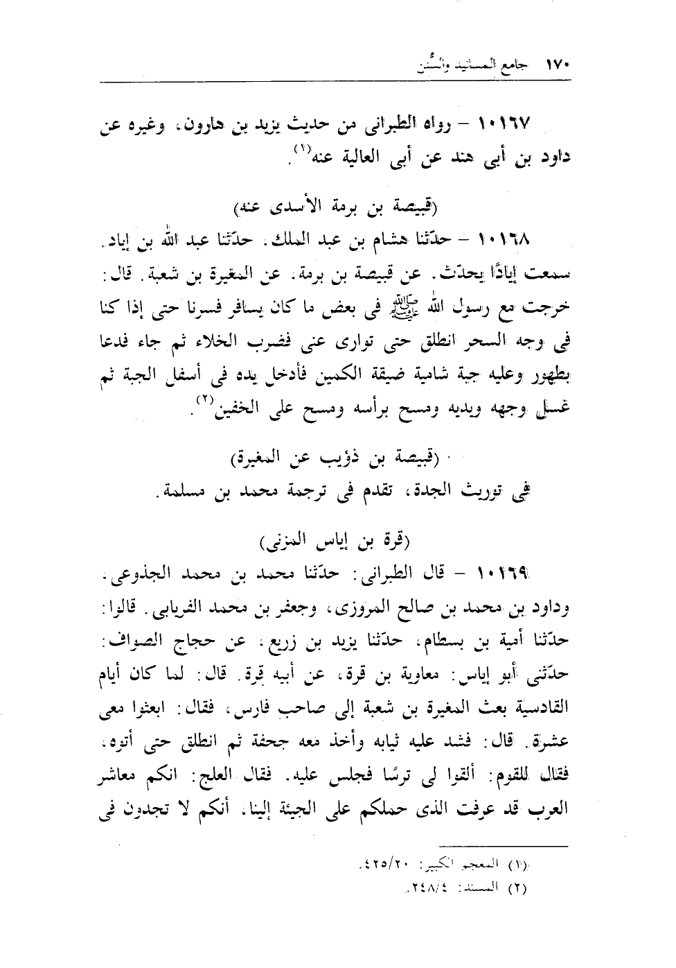 10168 - حدثنا هشام بن عبد الملك، حدثنا عبد الله بن إياد سمعت إيادا يحدث، عن قبيصة بن برمة، عن المغيرة بن شعبة. قال: خرجت مع رسول الله - صلى الله عليه وسلم - فى بعض ما كان يسافر فسرنا حتى إذا كنا فى وجه السحر انطلق حتى توارى عنى فضرب الخلاء ثم جاء فدعا بطهور وعليه جبة شامية ضيقة الكمين فأدخل يده فى أسفل الجبة ثم غسل وجهه ويديه ومسح برأسه ومسح على الخفين (¬2) .